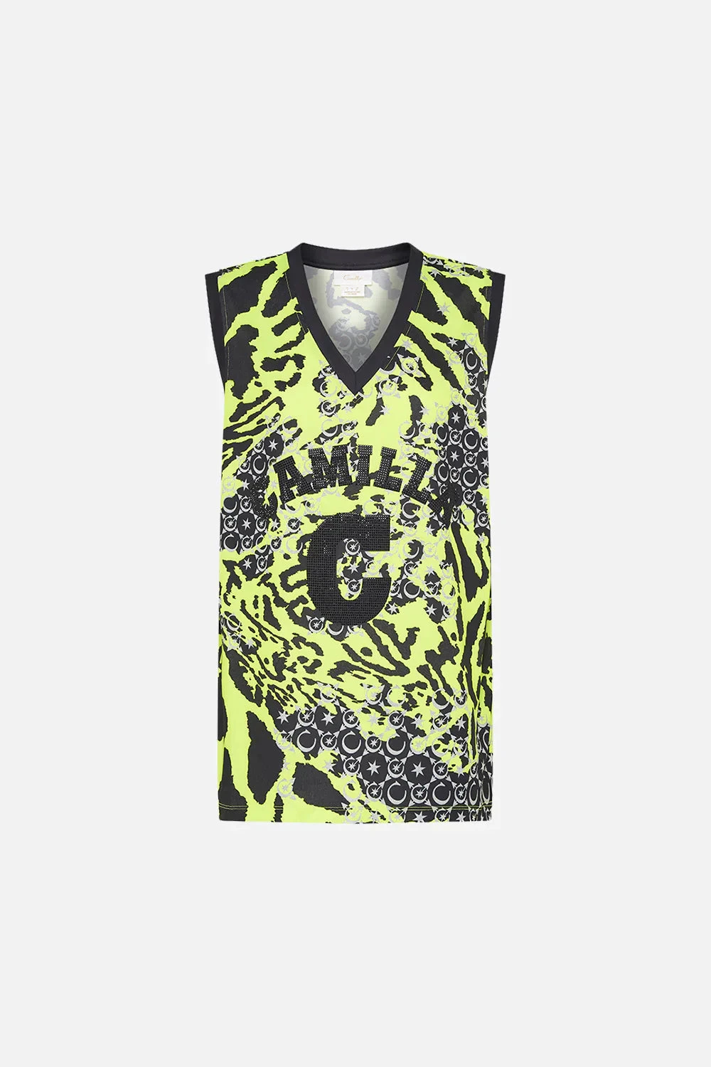 The Kat Kingdom Active Basketball Top steals our gaze with a symphony of animal print wrapped in the deepest of vibrant neon hues, our namesake CAMILLA initalling and star-dipped details. Crafted from a recycled polyester that keeps Mother Earth in mind, this luxury basketball top is home to a deep v neckline that meets wide straps at the décolletage, an effortlessly relaxed silhouette that falls to the hip and scintillating hand-placed crystal embellishment.
