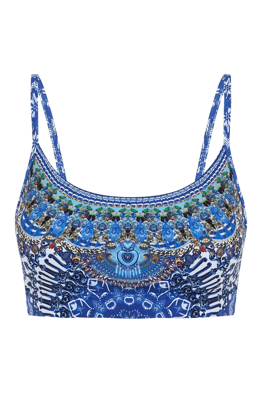 A symphony of coastal blues, the Nierika Active Crop is an ode to our spirited Pachamama collection, a look to CAMILLA seasons past. Intricate pattern detailing weaves throughout in shades of royal sapphire, white and pops of teal. Crafted with compression support and anti-pilling technology, this luxury active crop features a scoop neckline, customisable straps and a soft stretchy fit to mould to your silhouette. Style with the matching .