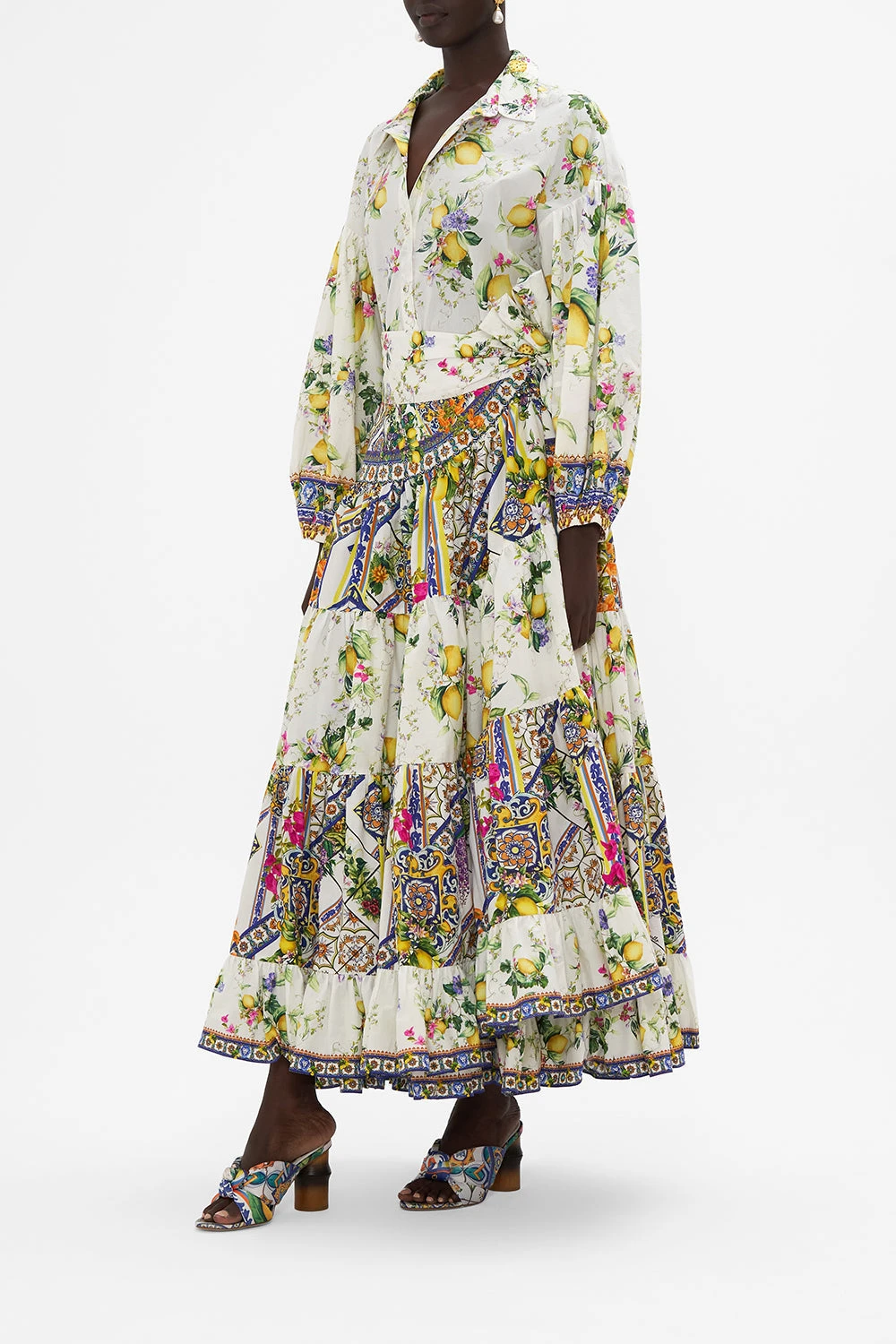 The Caterina Spritz Balloon Sleeve Shirt Blouse wanders through an elaborate arrangement of Italian mosaics, fresh citrus fruits and florals. A bright golden yellow path and grandiose arches reminiscent of the iconic Hotel Santa Caterina. Tailored to perfection this luxury cotton CAMILLA blouse plays host to dramatically voluminous blouson sleeves, a classic collar that flows into a front button enclosure and a relaxed fit silhouette. Wear back with the Caterina Spritz Wide Leg Waisted Pant for chic co-ord styling. Lovingly handcrafted, designed in Australia. Explore more from the Amore Mio collection.