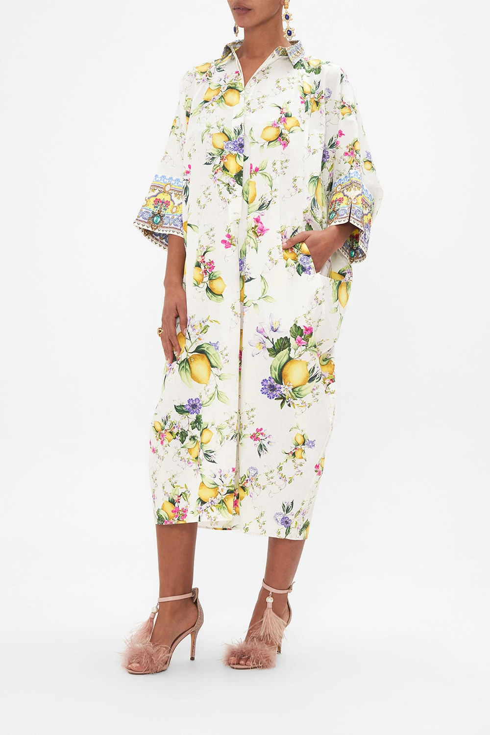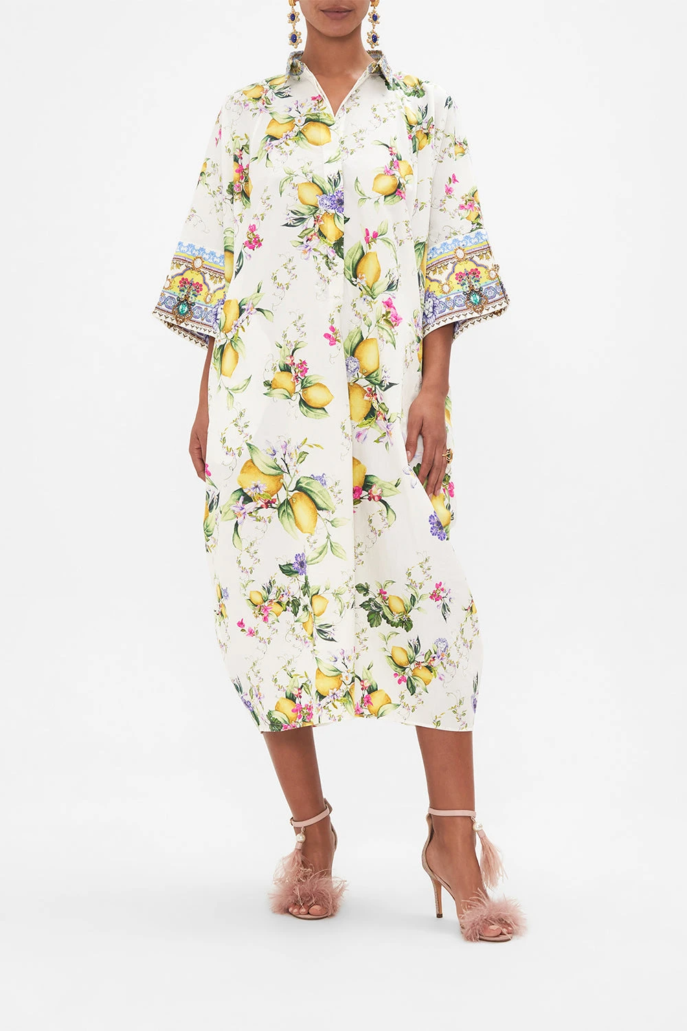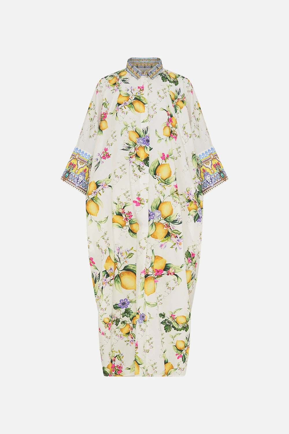 The Caterina Spritz Batwing Kaftan wanders through an elaborate arrangement of Italian mosaics, fresh citrus fruits and florals. A bright golden yellow path and grandiose arches reminiscent of the iconic Hotel Santa Caterina. A signature CAMILLA cotton kaftan adorned with billowy raglan sleeves finished with contrast printed cuffs, embellished with crystals, a softly tailored collar with placket detail and a floaty silhouette in the body that falls to a decadent maxi length. Lovingly handcrafted, designed in Australia. Explore more from the Amore Mio collection.