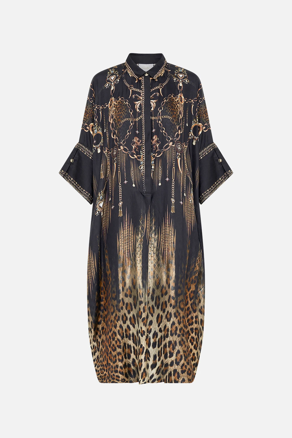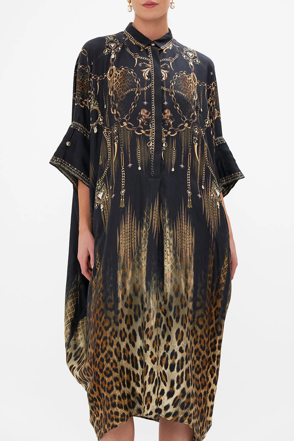 The Jungle Dreaming Batwing Kaftan is a tantalising vision of wild animal and tribal inspired geo patterns. A melding arrangement of glimmering chains, charms and topaz highlights. Complete with hand-embellished CAMILLA crystals, this luxury silk kaftan features statement raglan sleeves, an effortlessly relaxed silhouette, a structured collar and wide statement cuffs. Lovingly handcrafted and designed in Australia, explore more from The Moral Of The Story: Act II collection.
