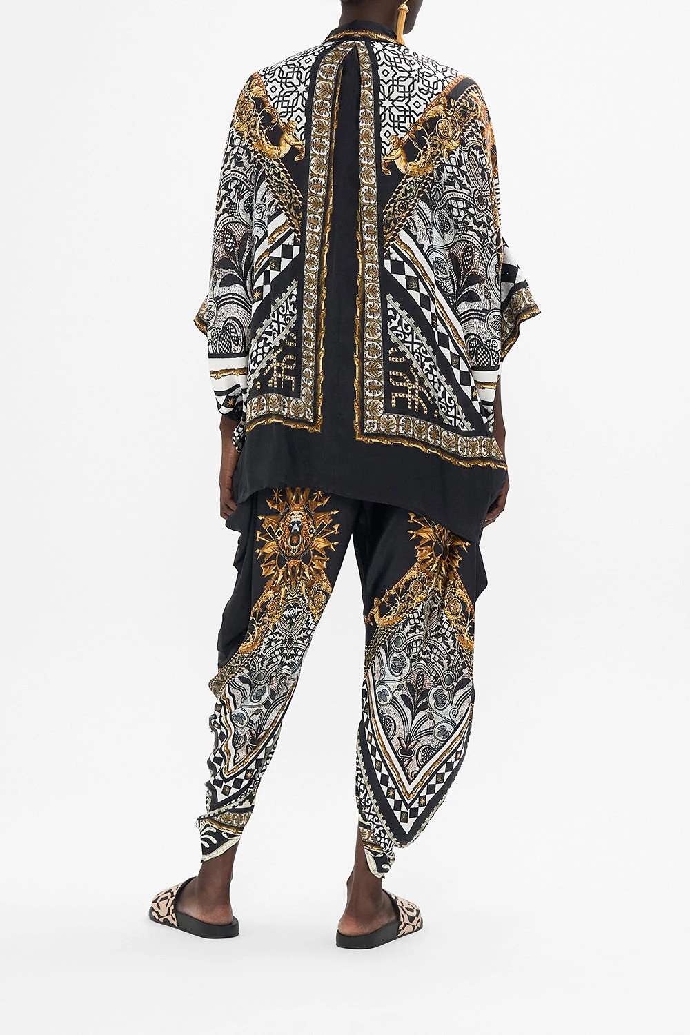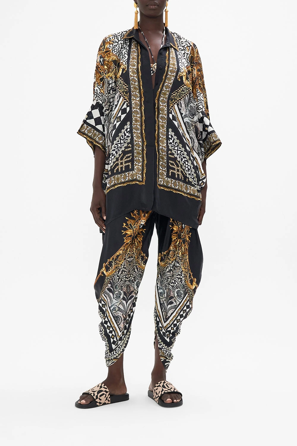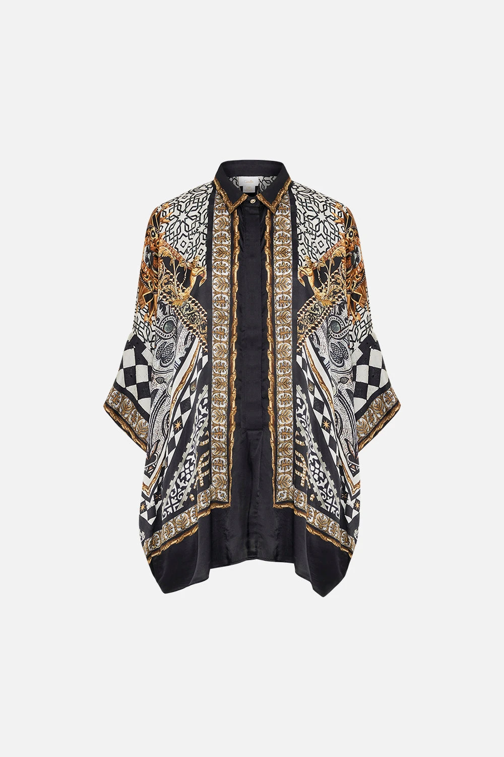 The Look Up Tesoro Batwing Shirt embodies a striking mosaic of bold graphic borderlines that dance with the opulence of gilded baroque filigree. Crafted from signature CAMILLA silk, this luxury shirt features crystal embellishments, wide raglan sleeves that dance at the elbow, button detailing and a relaxed, oversized silhouette. Pair with Look Up Tesoro Draped Side pant for dramatically draped decadence. Lovingly handcrafted, designed in Australia. Explore more from the Amore Mio collection.