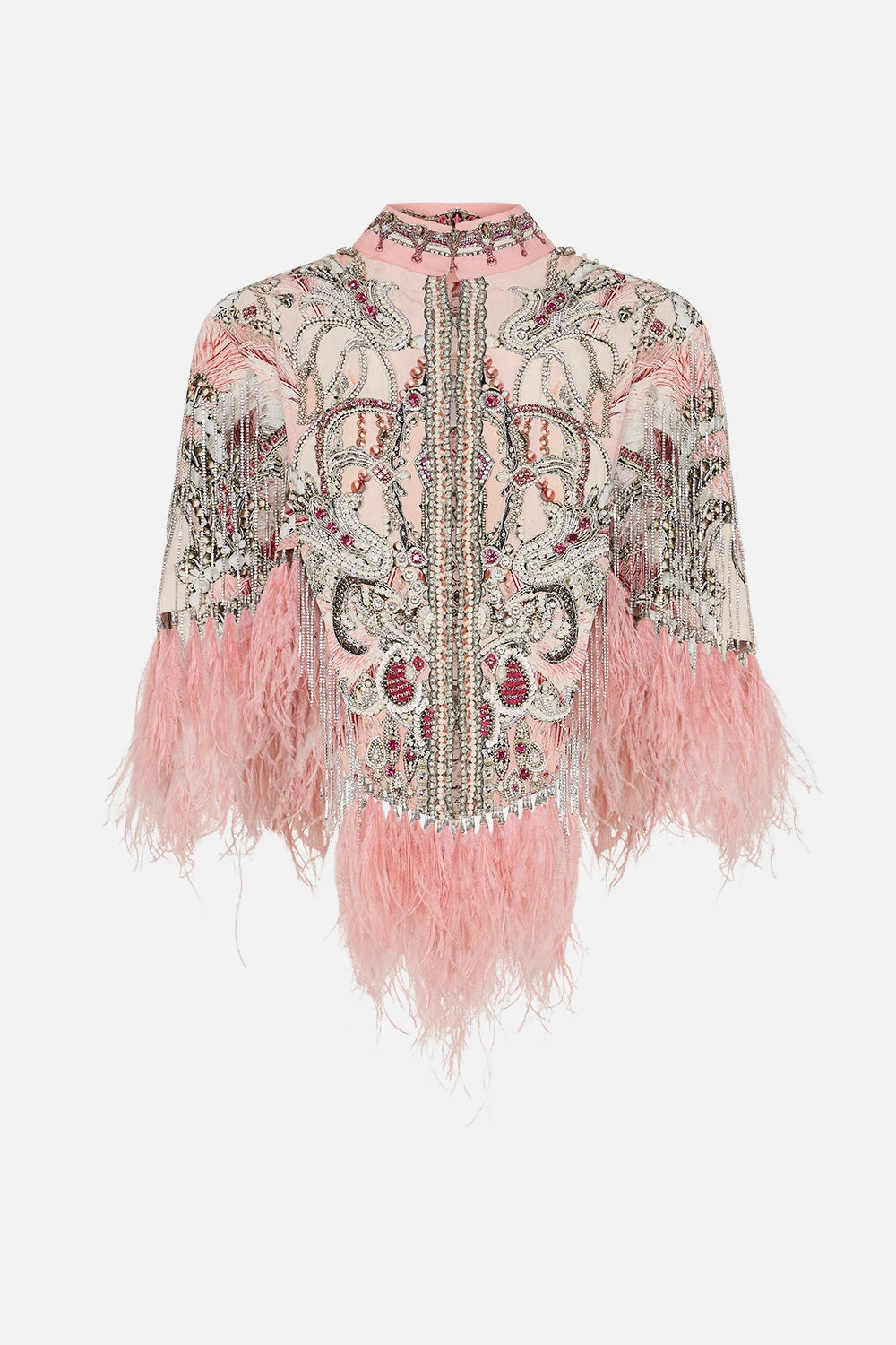 The Starships Sistas Beaded Gilet explores a mosaic dipping into a palette of peachy creams and watermelon pinks as feathered details billow amidst chain accents and ornaments of royalty.