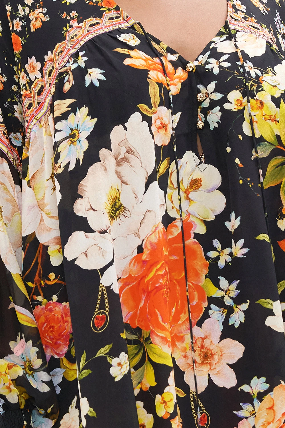 The Secret History Blouson Blouse With Neck Tie is set in a garden of rich imperial florals imbued with precious hidden gems. Adorning hand-embellished CAMILLA crystals, this luxury blouse features a statement blouson sleeve, dainty neck-tie details, shirred cuffs and gathered accents that define the bodice before meeting a delicately flared hemline. Lovingly handcrafted and designed in Australia, explore more from The Moral Of The Story: Act II collection.