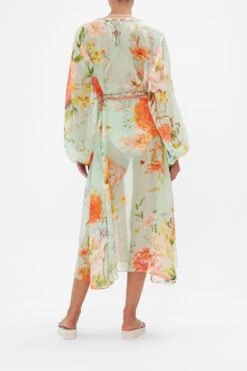 This statement dress features a high-low hemline to give brief glimpses of the legs, a wrap-front silhouette to cinch and shape the waist, dainty blouson sleeves and ruffles at the base.
