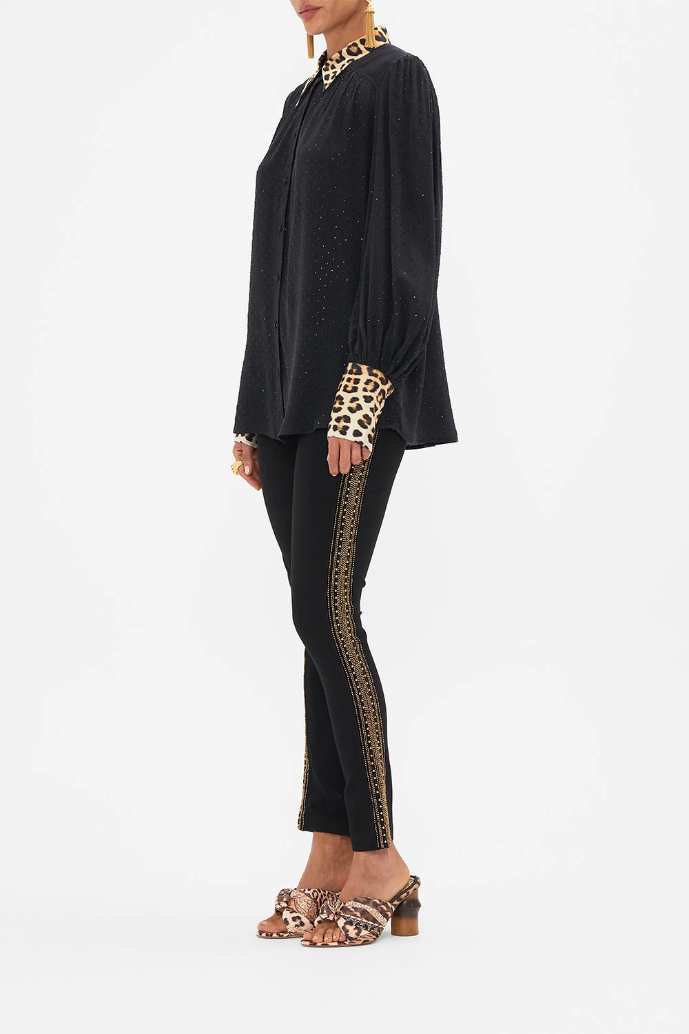 The Standing Ovation Button Through Blouson Sleeve Blouse captures the unbridle inspirational spirit of the infamous Teatro alla Scala through a rhapsody of rich leopard print. This luxury black silk blouse features shimmering crystals throughout the relaxed silhouette, contrast collar and cuffs finishing the soft blouson sleeves. Made for wanderlust women who move through the world in style. Lovingly handcrafted, designed in Australia. Explore more from the Amore Mio collection.