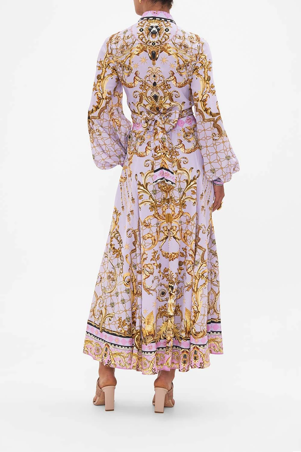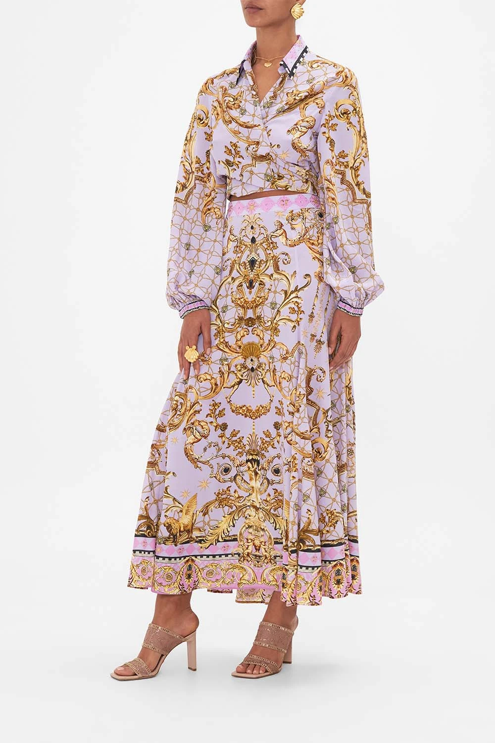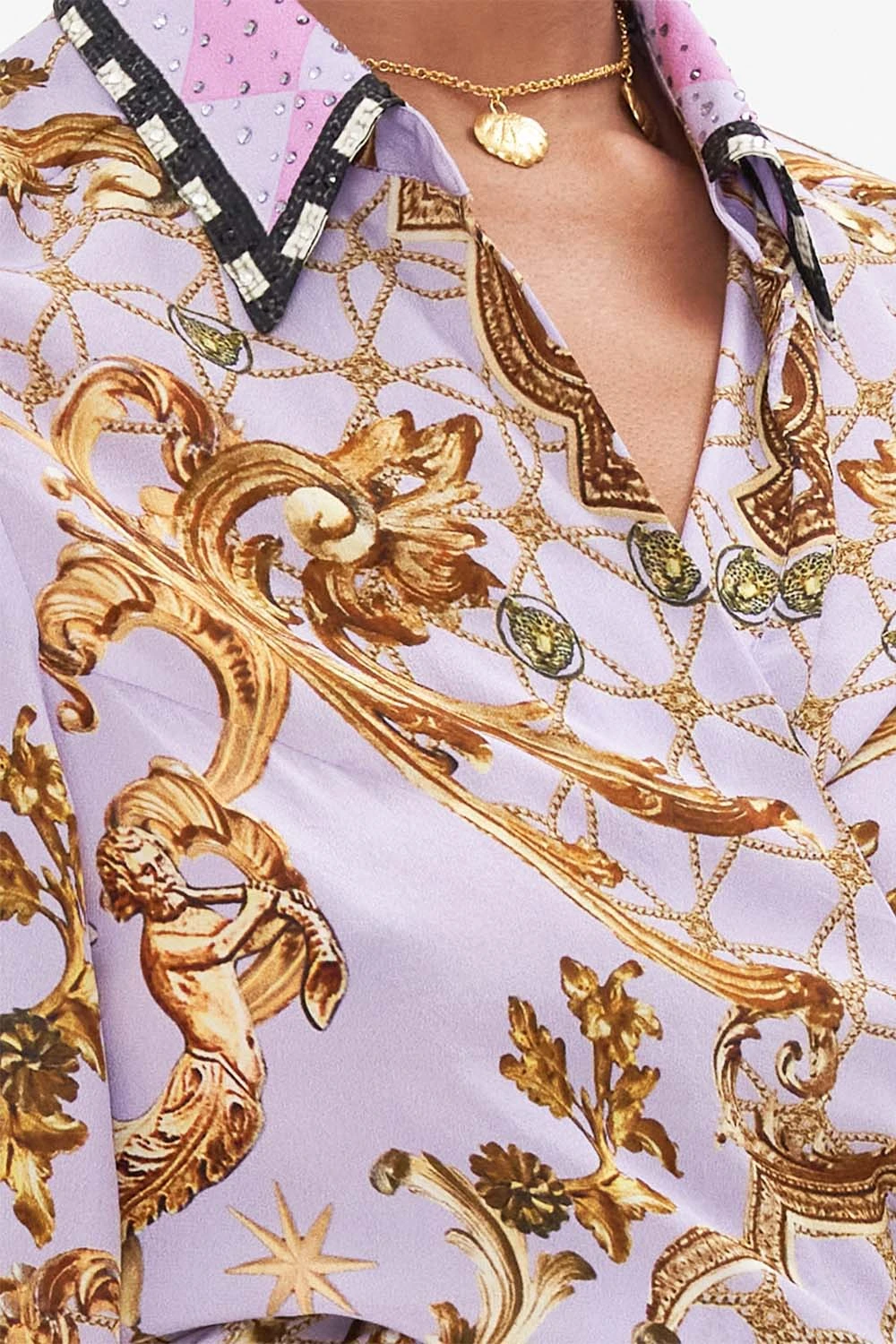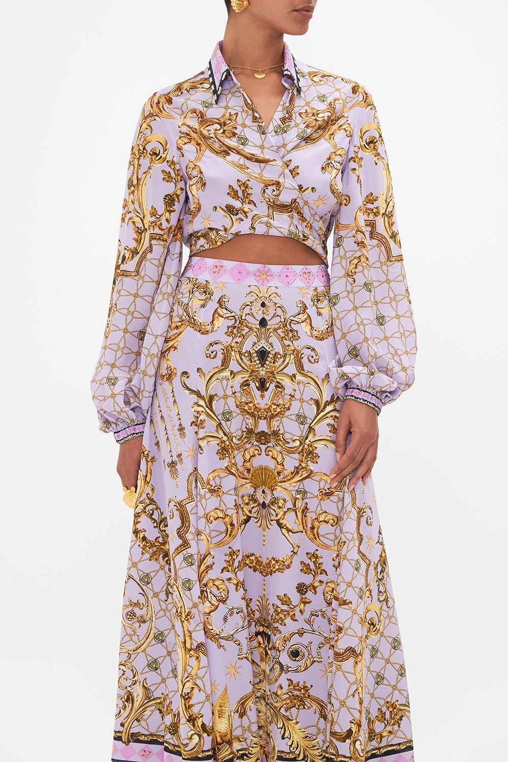 The Lavender Ever After Cropped Wrap Shirt steps into a pastel dreamscape of sculptural curves and gilded fronds. A heavenly arrangement of charms and royal crests imbued in myth and magic. Adorning CAMILLA crystals, this luxury silk shirt features a fitted wrap-style silhouette, voluminous blouson sleeves and tie fastening to cinch and shape. A beautiful fit and flare silhouette created by pairing with the Lavender Ever After Panelled Flared Long Skirt. Lovingly handcrafted, designed in Australia. Explore more from the Amore Mio collection.