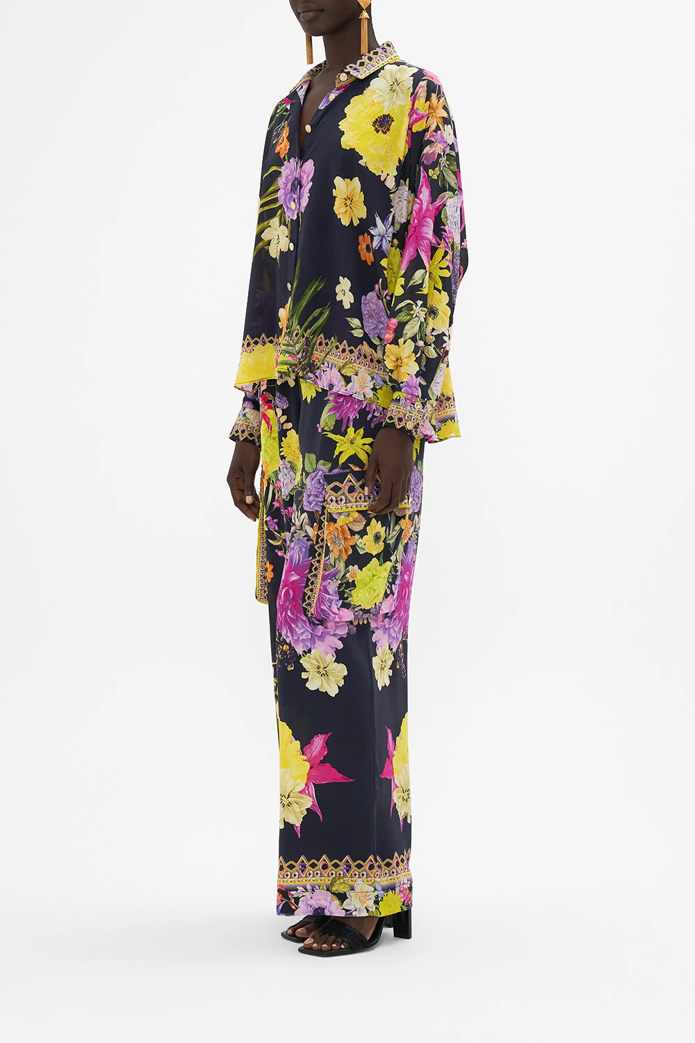 The Peace Be With You Curved Hem Shirt explores a decadent sea of midnight hues finished with blooming peonies dipped in canary hues, tulips wrapped in mesmorising tones and lilac hydrangeas nestled between leafy greens. Crafted from breathable silk, this luxury blouse is home to hand-embellished crystals, delicately bloomed blouson sleeves and a relaxed silhouette that cascades into a high-low hemline.