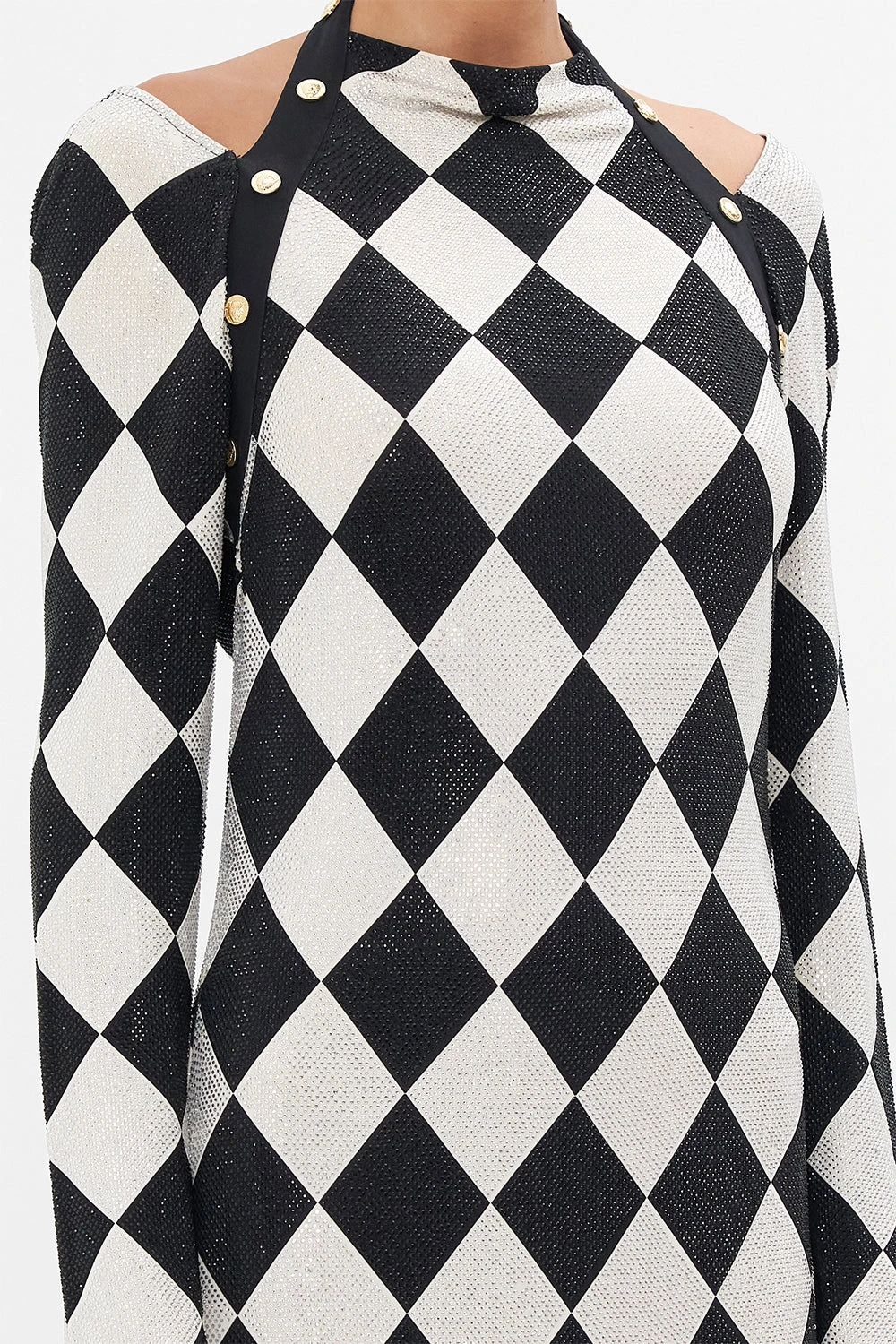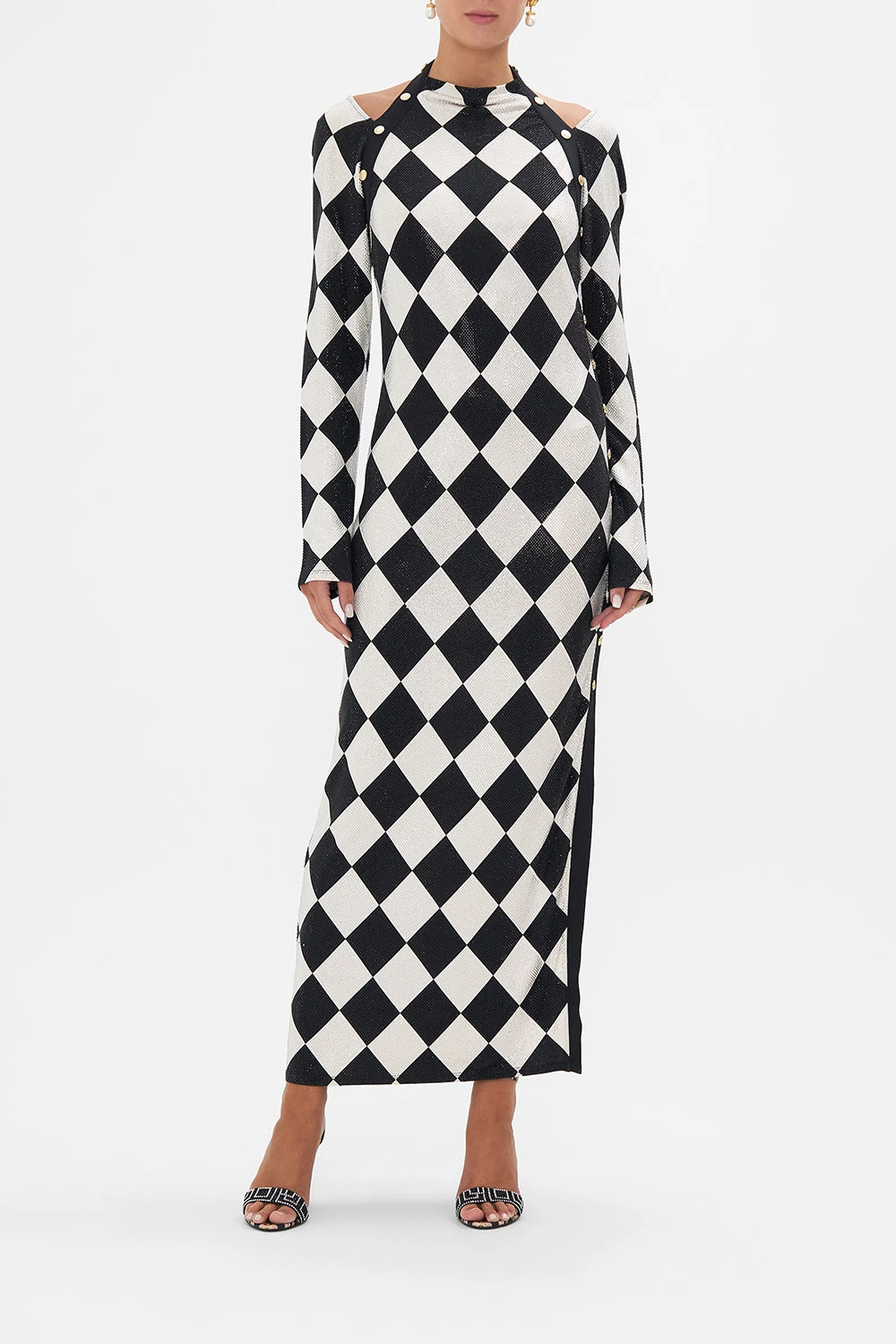 The Duomo Dynasty Cut Out Shoulder Jersey Dress pays homage to the opulent palatial interiors of the past. A striking mosaic of ivory and onyx highlights the glimmering gold charms and royal crests imbued in myth and magic. A sleek silhouette that epitomises elegance, this luxury jersey dress features a fitted maxi silhouette, snap button details, tantalising shoulder cut-outs, a deep v backline and CAMILLA crystals throughout. A bold statement party dress to keep you looking stunningly stylish at any soiree. Lovingly handcrafted, designed in Australia. Explore more from the Amore Mio collection.