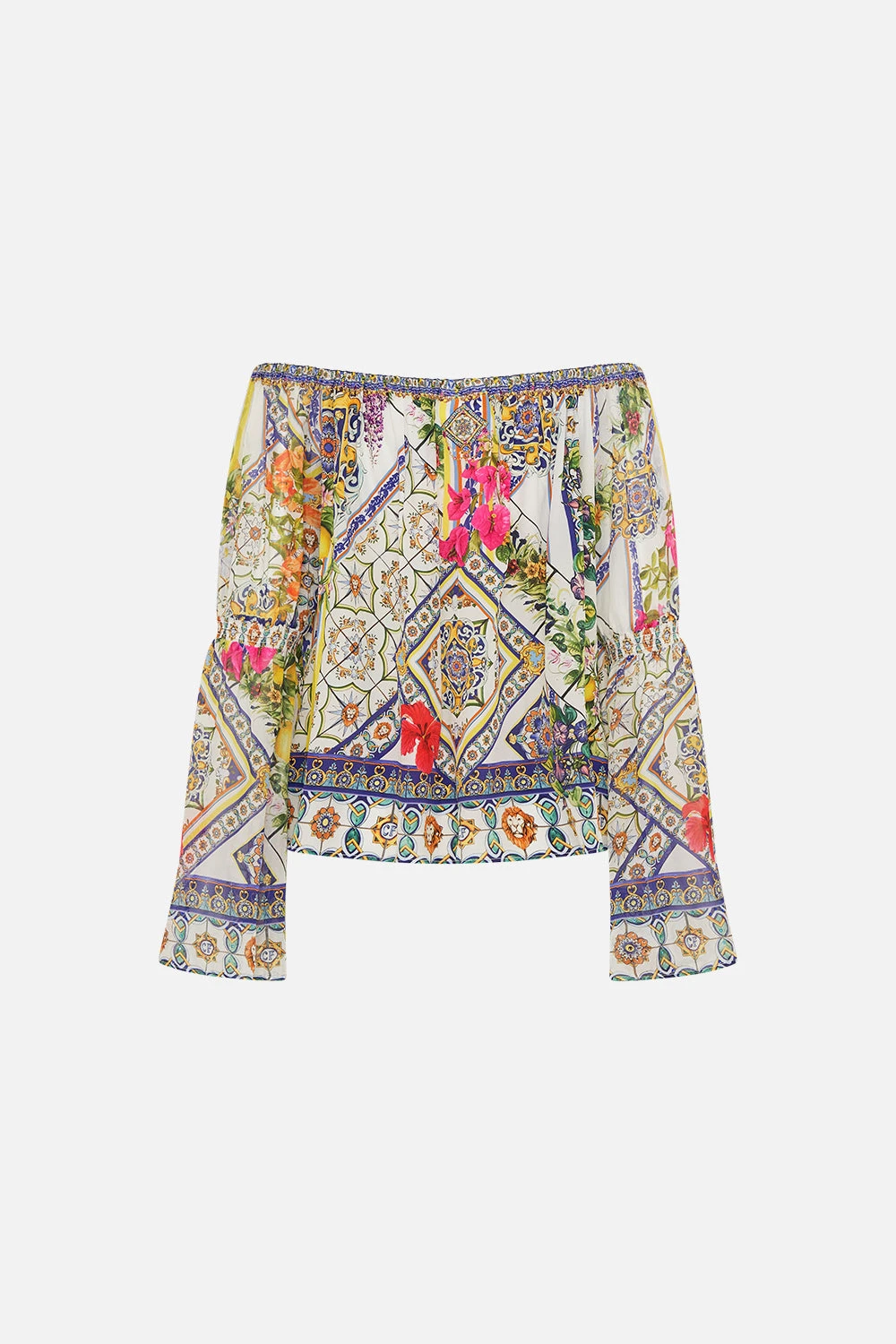 The Amalfi Amore Drop Shoulder Bell Sleeve Top celebrates the vista views through iconic archways lined with fragrant florals at the Hotel Santa Caterina. This luxury CAMILLA silk off the shoulder top features a full length bell sleeve, delicate neck ties, finished with signature CAMILLA crystals that dance along the decolletage, and a relaxed fit silhouette. Style back with the Amalfi Amore Lounge Pant as a lavish matching set. Lovingly handcrafted, designed in Australia. Explore more from the Amore Mio collection.