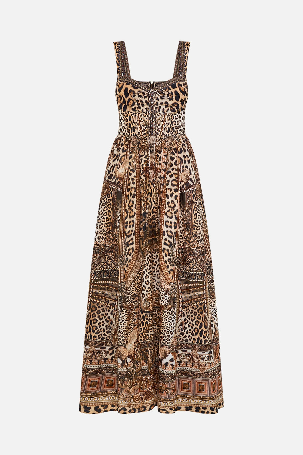 The Standing Ovation Eyelet Bustier Dress captures the unbridle inspirational spirit of the infamous Teatro alla Scala through a rhapsody of rich leopard print. Crafted from rich lightweight linen, this luxurious CAMILLA leopard print dress features a sleek bustier bodice that falls into full skirt. Metal eyelet closure and finished with signature crystals that scintillate with every step. A stunning take on a floral sundress or a romantic twist on a wedding guest dress. Lovingly handcrafted, designed in Australia. Explore more from the Amore Mio collection.
