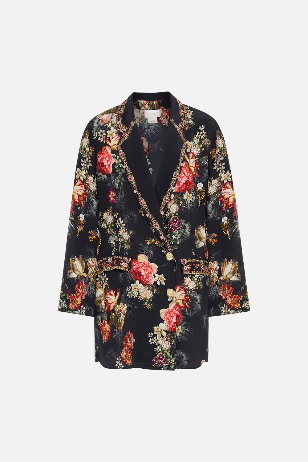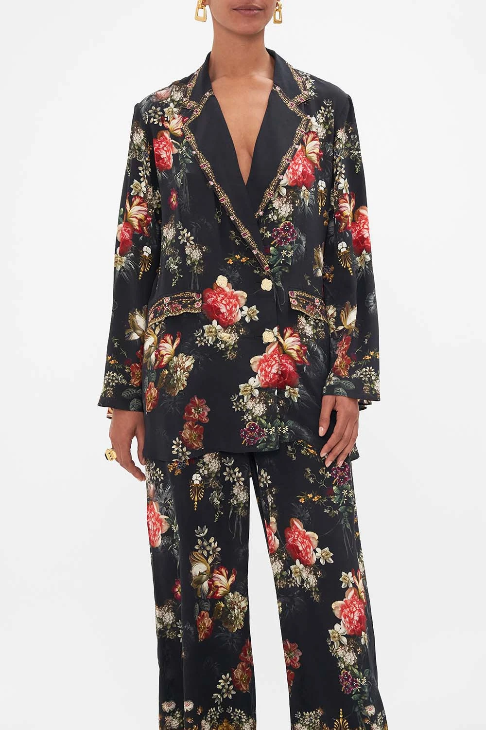 The A Night At The Opera Flared Sleeve Double Breasted Jacket echoes the sweet symphony of frescoes adorning opulent florals, ethereal cherubs and grand gilded archways. Decadently finished with the subtle shimmer of embellished crystals, this luxury CAMILLA silk blazer homes a tailored lapel that falls into a relaxed silhouette, wide statement sleeves and cross over button enclosure. Pair with the Night At The Opera Minimal Wide Leg Pant for ultimate polished perfection. Lovingly handcrafted, designed in Australia. Explore more from the Amore Mio collection.