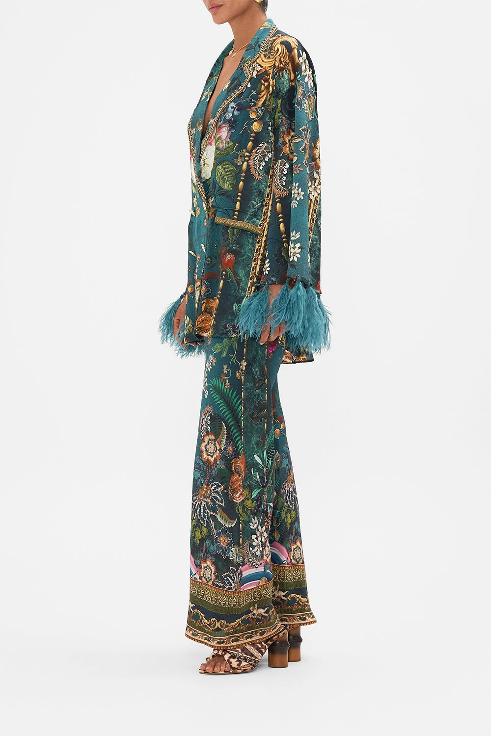 The Verdi’s World Flared Sleeve Double Breasted Jacket is an immersion into the luscious green and opulent golds reminiscent of the Grand Hotel Et De Milano. Decadently finished with the subtle shimmer of crystals, this luxury CAMILLA silk blazer homes a chic structured lapel that falls into a relaxed silhouette, wide statement sleeves with delicate plumes of feathers upon the cuffs. Finished with a cross over button enclosure for sleek soft tailored line. Pair with the Verdis World Bias Cut Drawstring Pant for ultimate polished perfection. Lovingly handcrafted, designed in Australia. Explore more from the Amore Mio collection.
