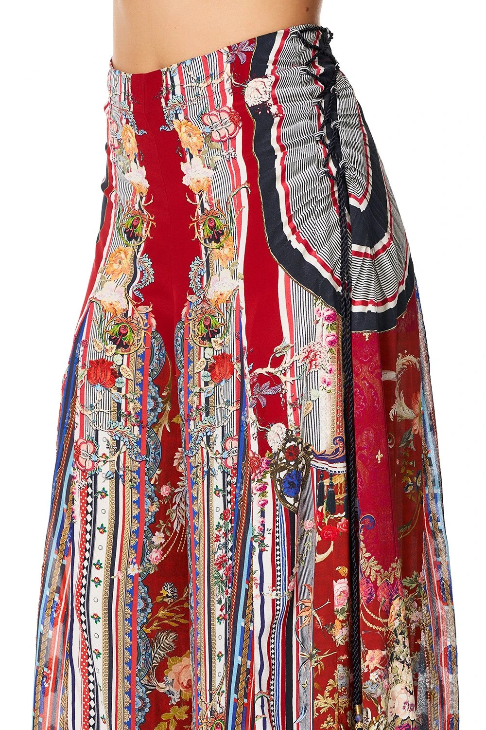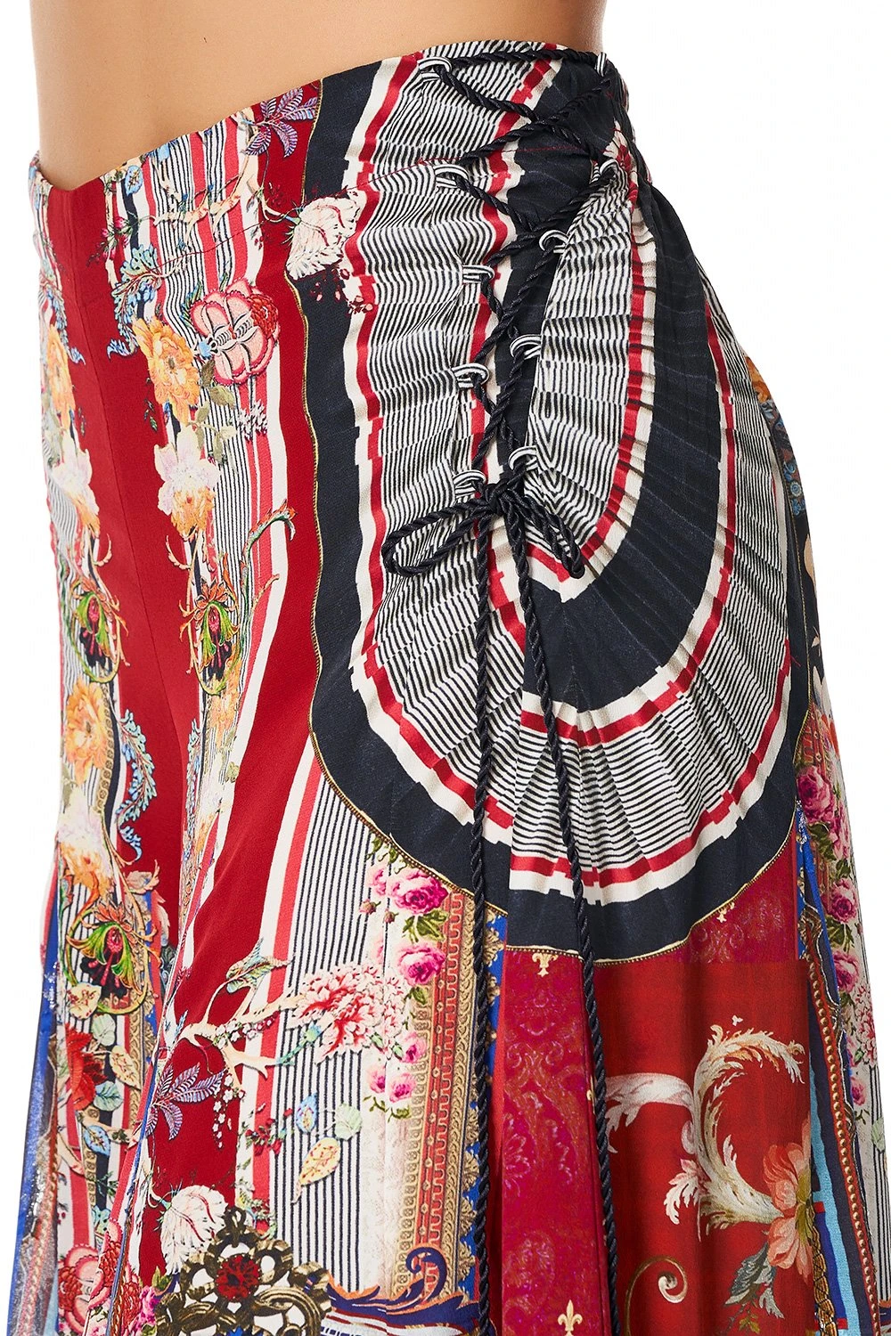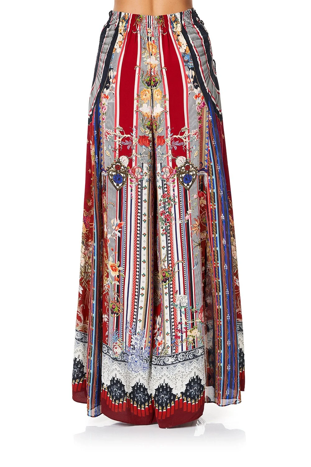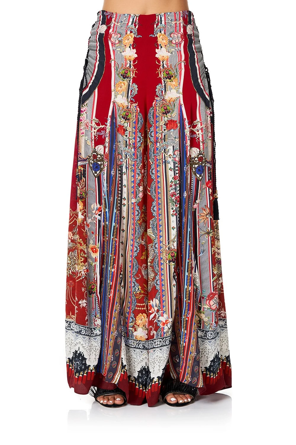 In honour of the bohemian gold found at Les Puces de Saint-Ouen flea markets, the Costume Party Flares with Lace Up Side ooze ornate charm. With crimson hues, these patterned palazzo pants feature charming lace up side ties, flattering elastic back waist, digitally printed sweeping silk, and hand-placed crystals as detail.