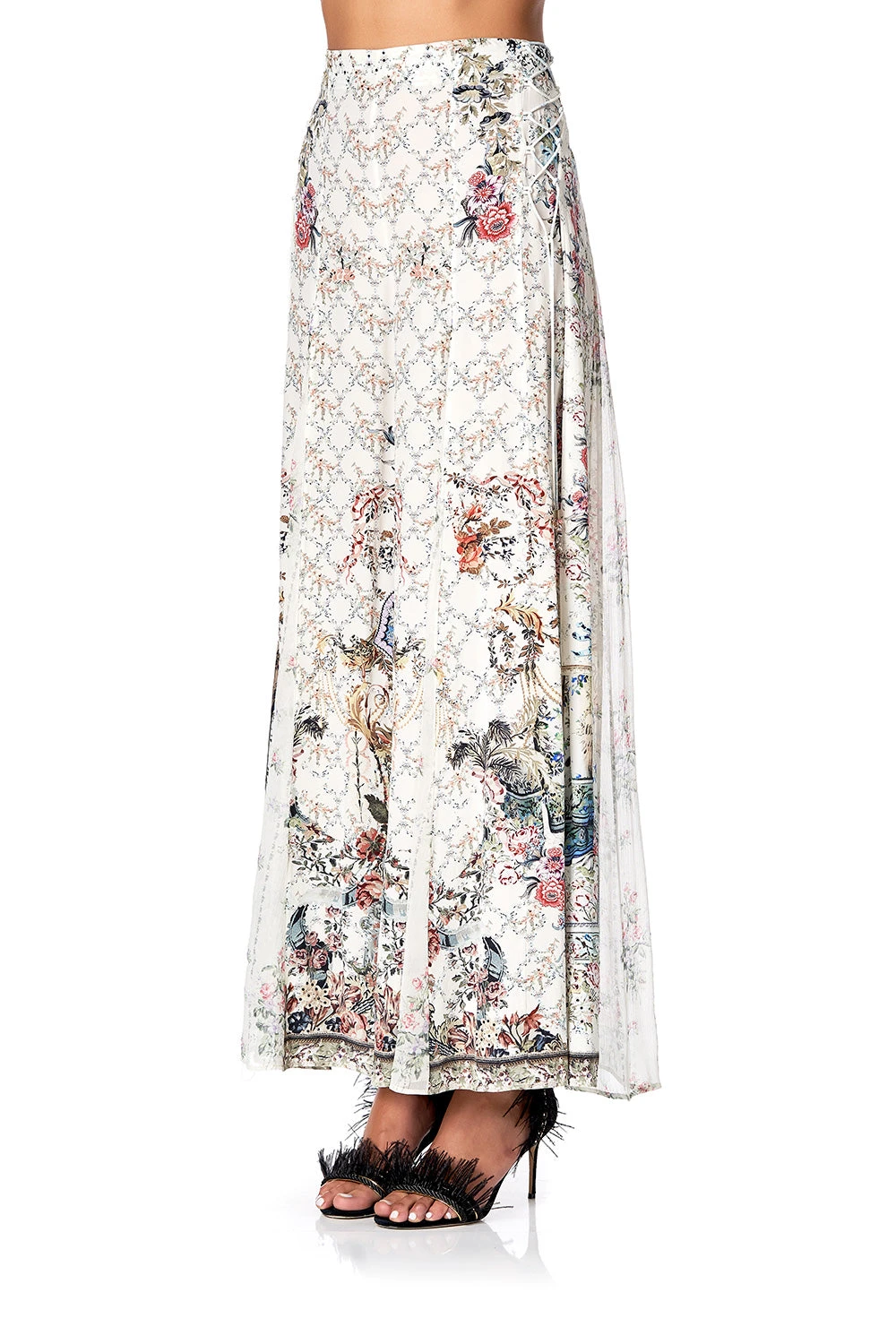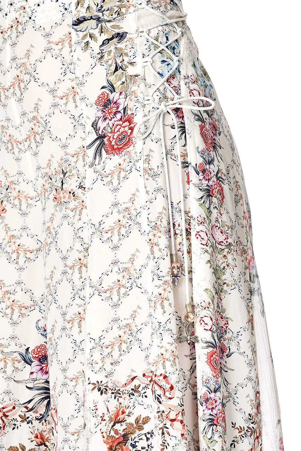 The Southern Belle Flares with Lace Up Side are perfect for weekend revelries and sunny soirees. Inspired by the glamour of the Cote d’Azur, these luxurious silk trousers feature lace up side ties, contrast godets, digitally printed silk, as well as hand-placed crystals as detail.