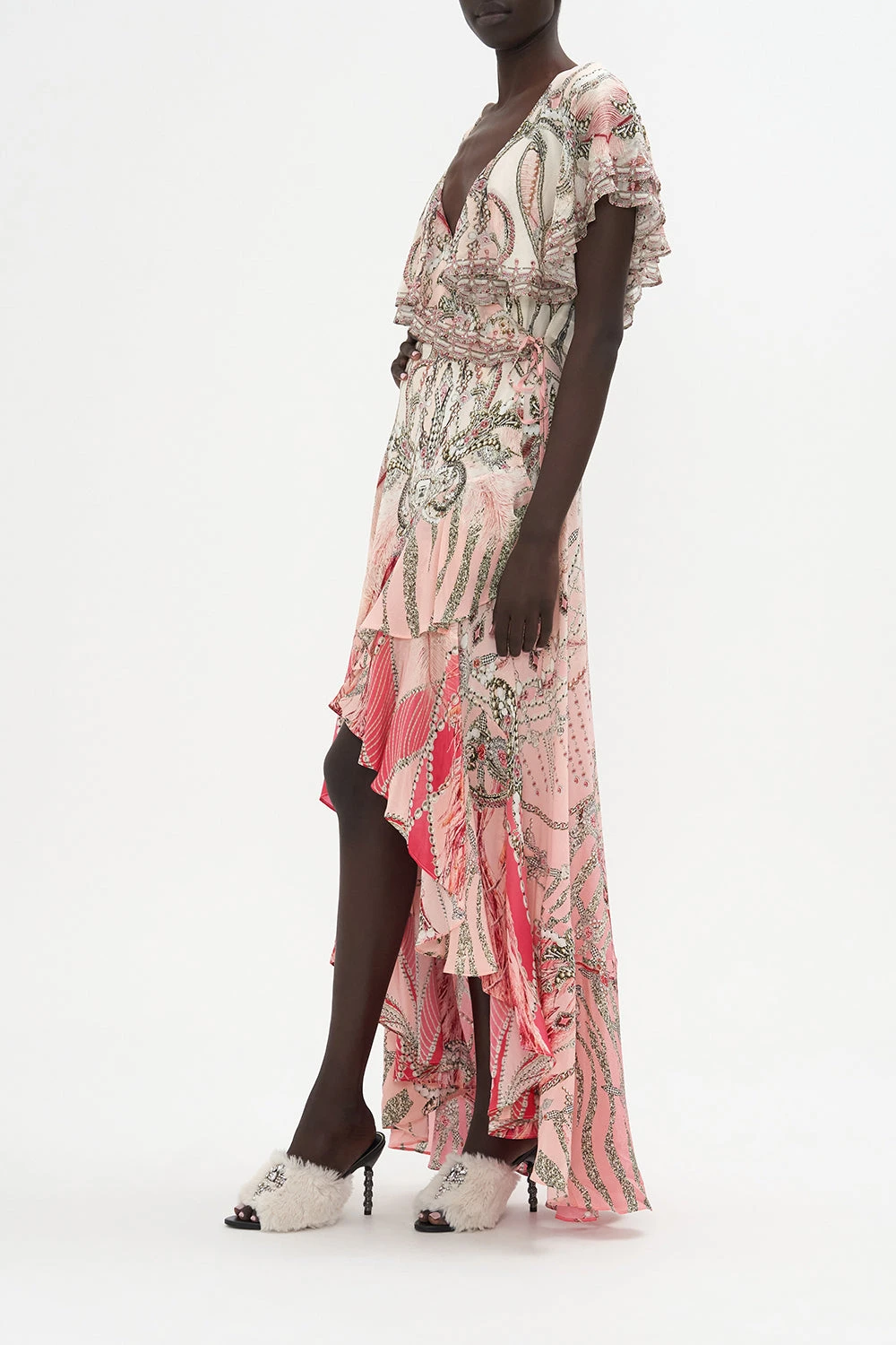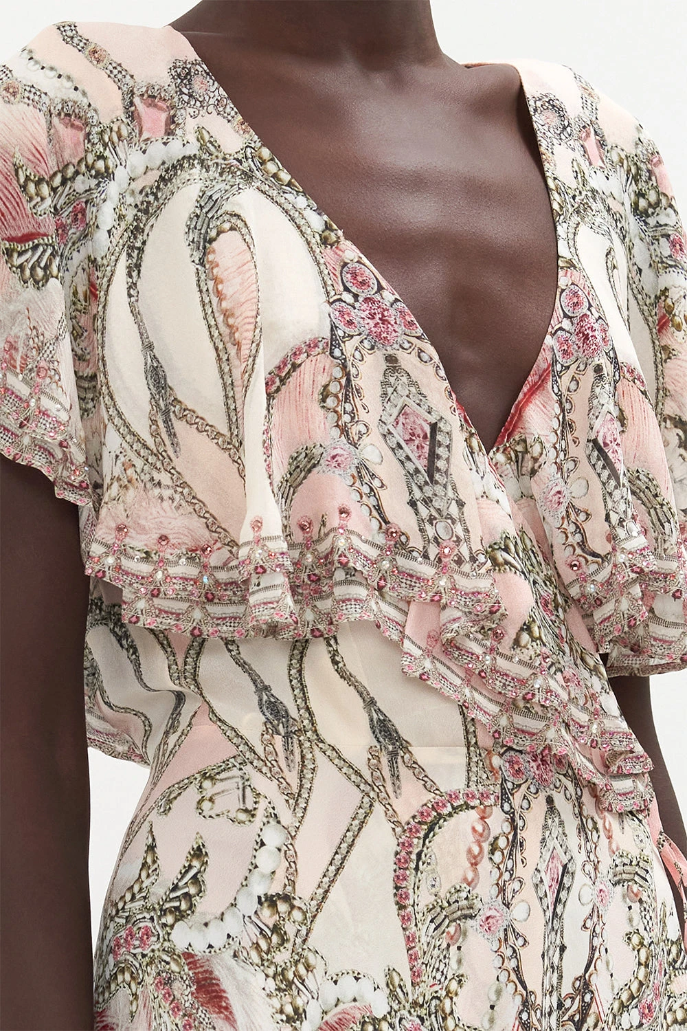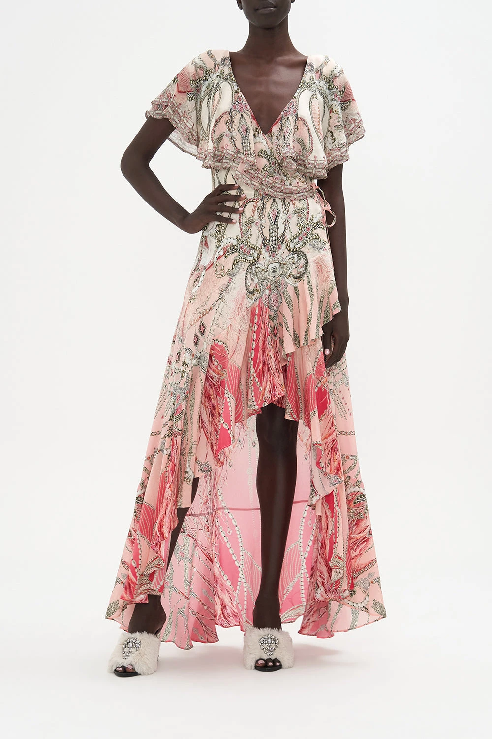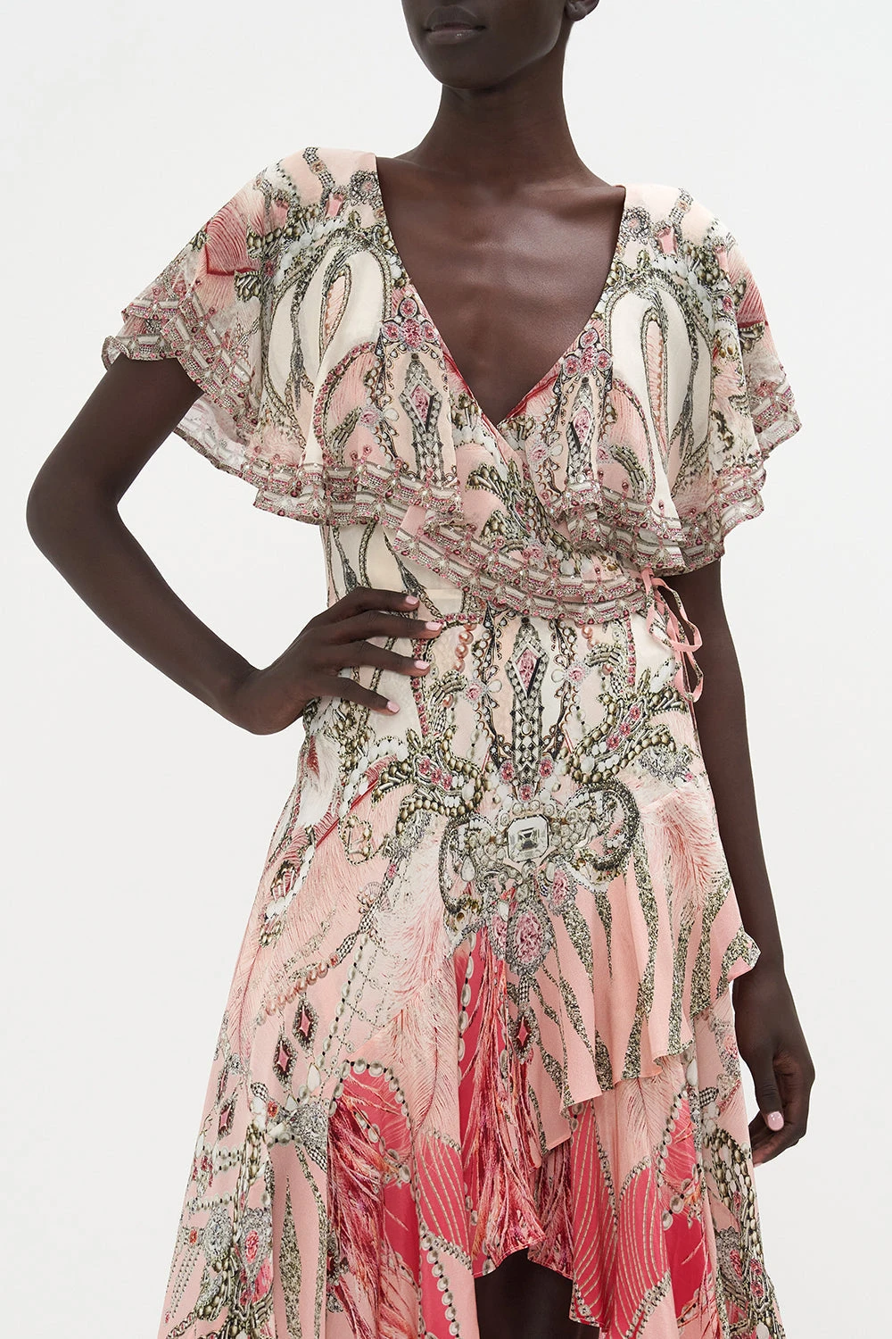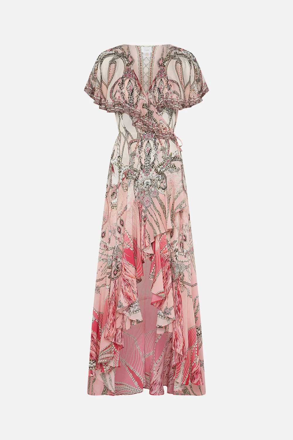 Crafted from signature CAMILLA silk, this luxury dress is finished with a wrap-style silhouette that pulls the waist in, contrast panelling at the hems, frill details and a high-rise cut that elongates the legs.
