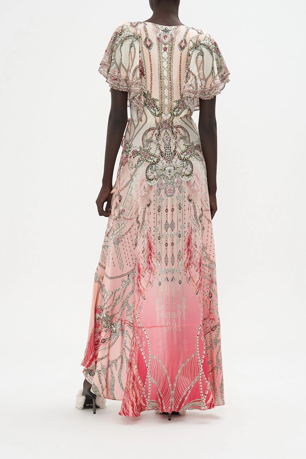 The Starships Sistas Frill Sleeve Long Dress explores a mosaic dipping into a palette of peachy creams and watermelon pinks as feathered details billow amidst chain accents and ornaments of royalty.