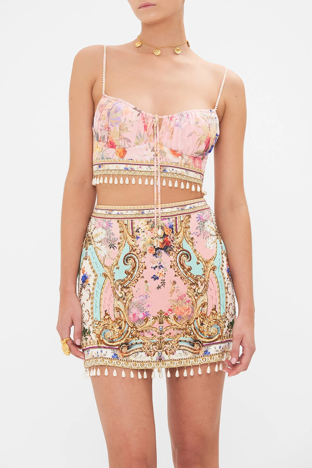 The Letters From The Pink Room Gathered Bralet depicts an atmosphere of soft pink with turquoise highlights amongst a world of pretty blooms and golden filigree. Crafted from signature CAMILLA silk, this luxury bralet top features dainty straps that can be adjusted for your perfect fit, gathered bust detailing, intricate quilted stitching and classic hook and eye enclosure. Pair with the Letters From The Pink Room Sheer Wide Leg Pant for a chic matching set. Lovingly handcrafted, designed in Australia. Explore more from the Amore Mio collection.