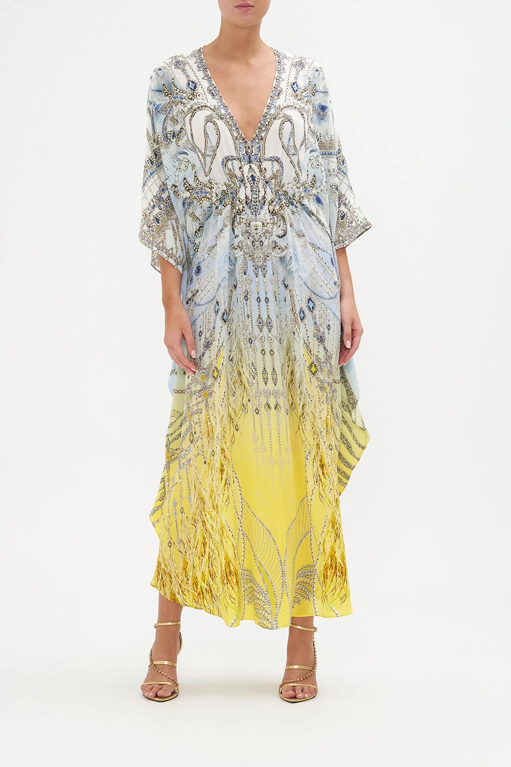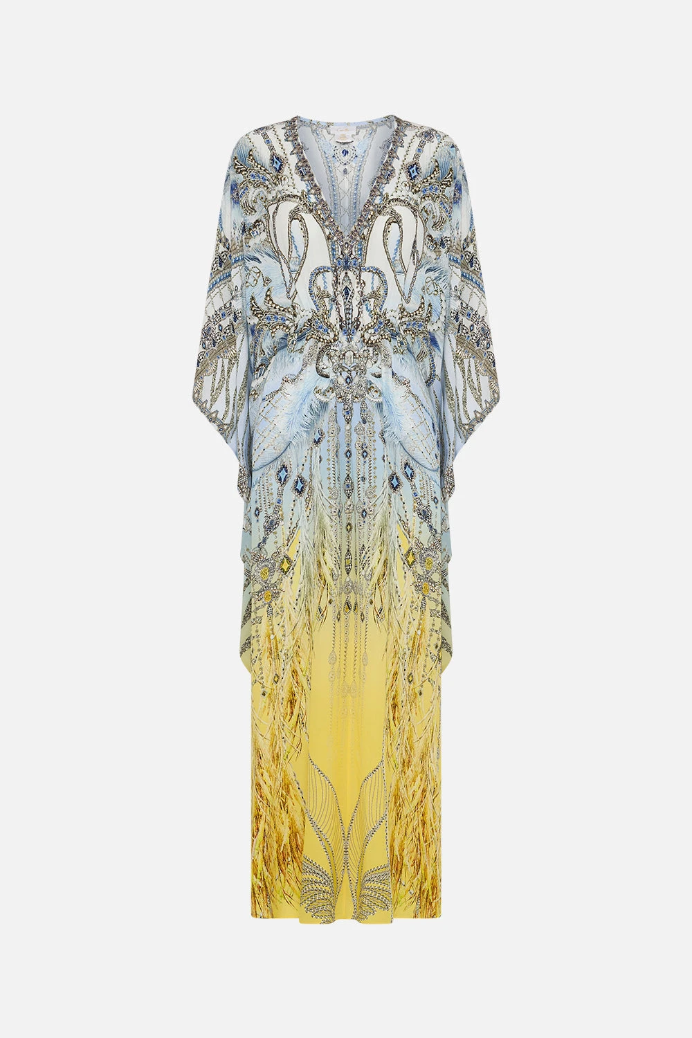 The Moon And Back Gathered Waist Kaftan explores a mosaic dipping into a palette of icy blues and lemon hues as feathered details billow amidst chain accents and ornaments of royalty. Finished with hand-placed CAMILLA crystals, this luxury silk kaftan plays host to a deep v neckline, a relaxed maxi silhouette that falls into a curved hemline and wide statement sleeves that cascade above the wrist.