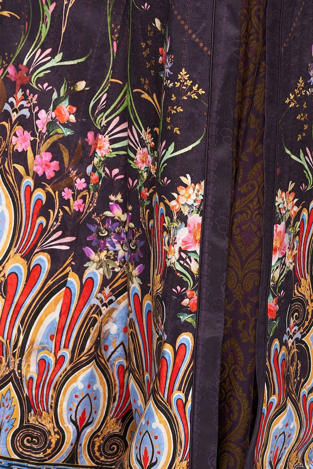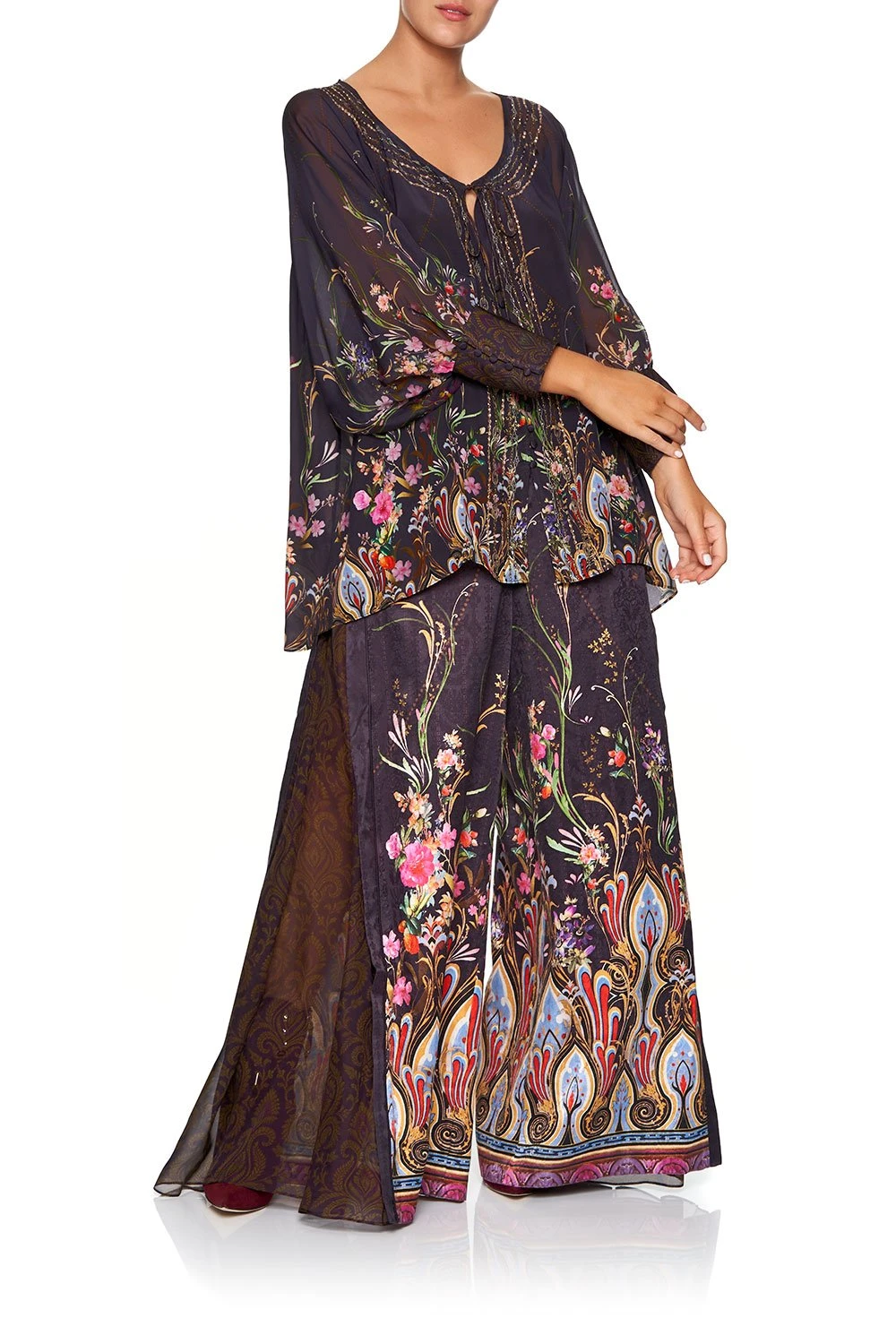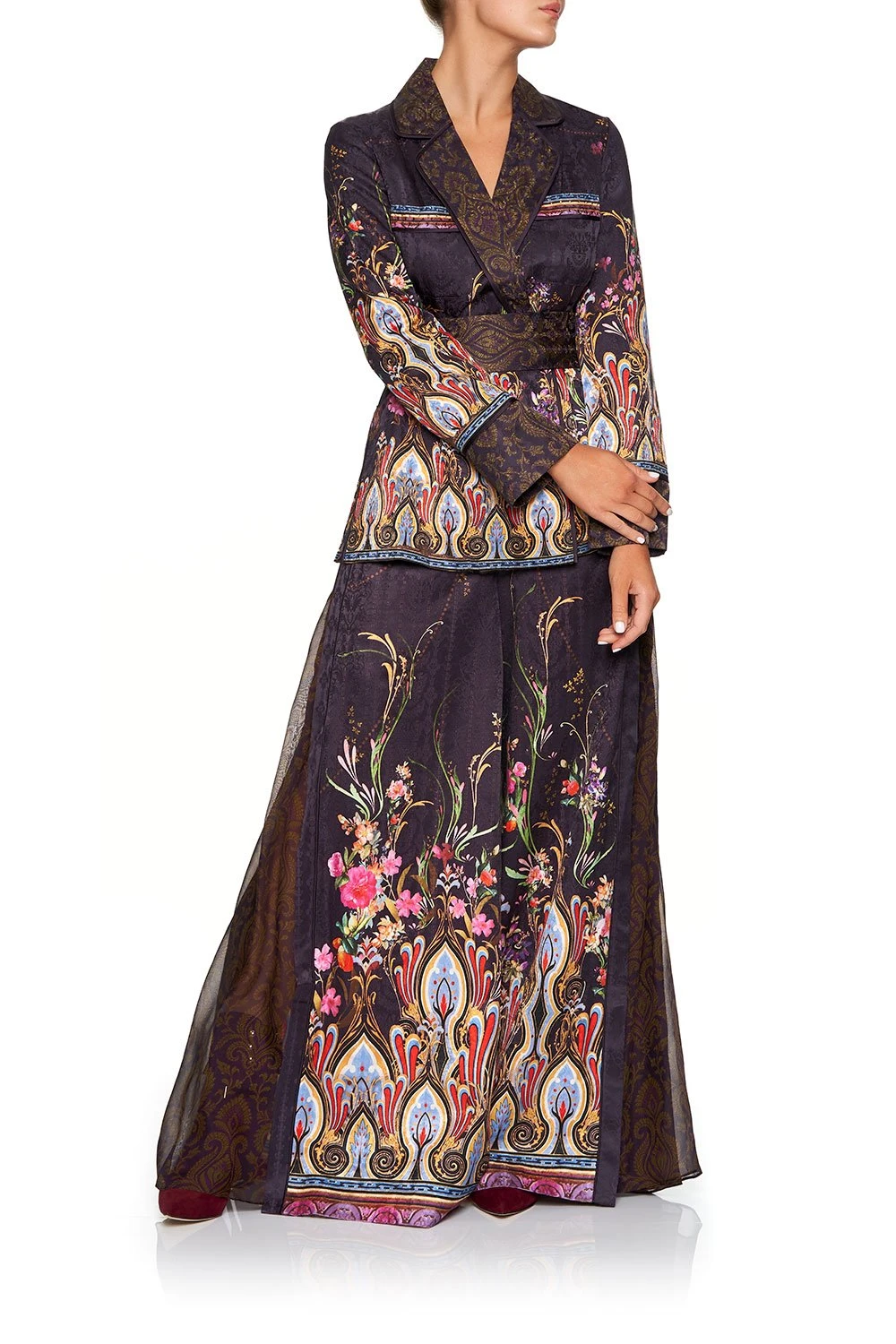As an ode to the whimsical designs of the French Jardins, the Wild Flower High Waisted Trouser with Godet is quietly opulent. With moody floral flourishes, these ornate silk trousers boasts a wide full leg, alluring godets in contrast fabric, flattering elasticated waistband at the back, as well as sumptuous all-over print.