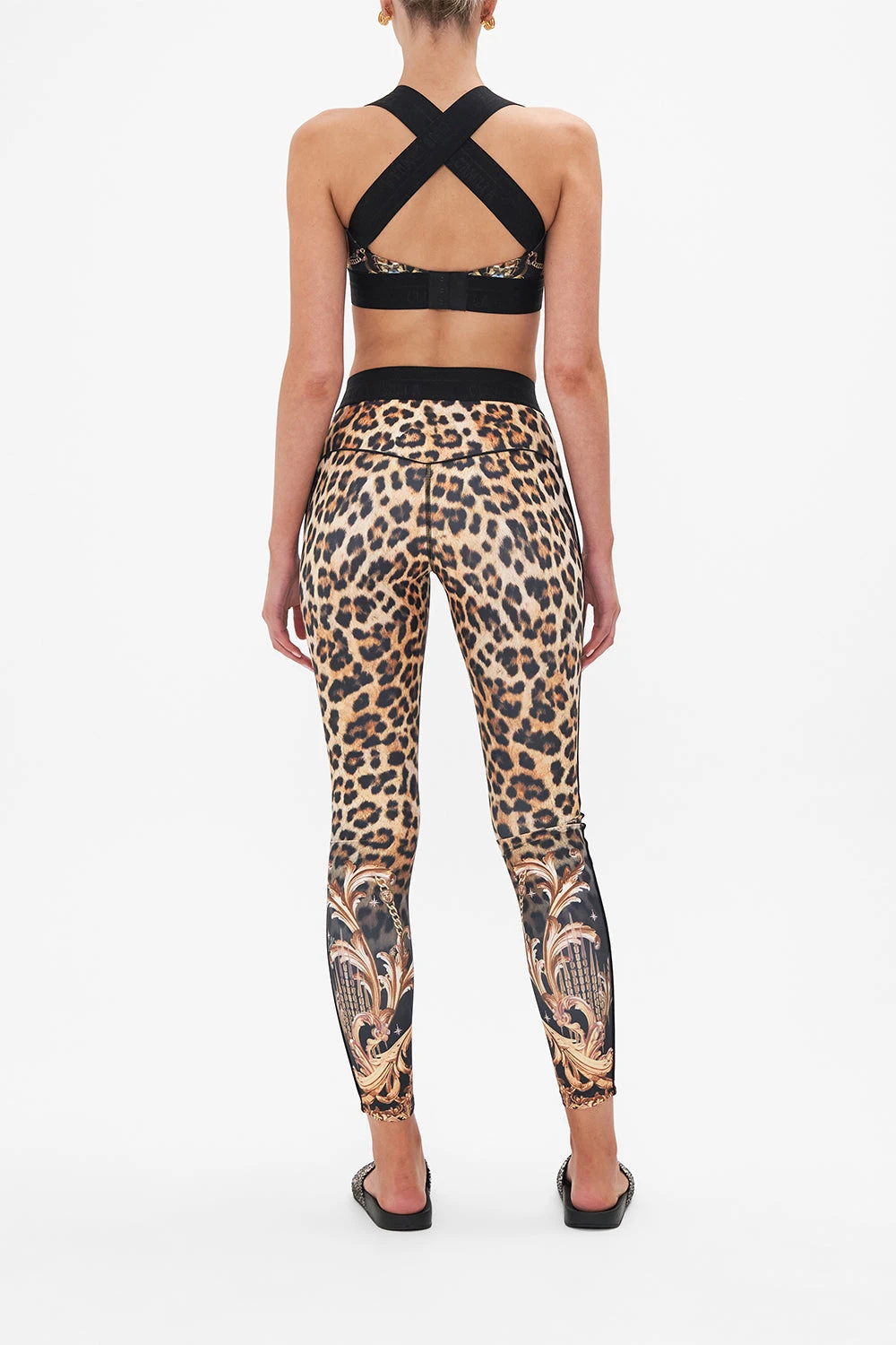 The Running In The Wild Jacquard Elastic Strap Bra With Centre Front Cut Out sports classic leopard print highlighted by golden baroque flourishes intertwined with fine chain and precious charms. Crafted with crease resistant technology, this luxury sports bra plays host to elasticated cross-back straps that fall into compression support and a lavish jacquard fabric that sits softly against the skin as you’re secured with back clip fastening. Lovingly crafted and designed in Australia, explore more from The Moral Of The Story: Act II collection.