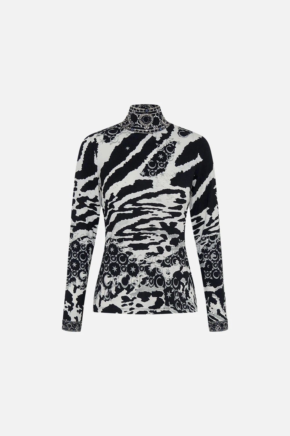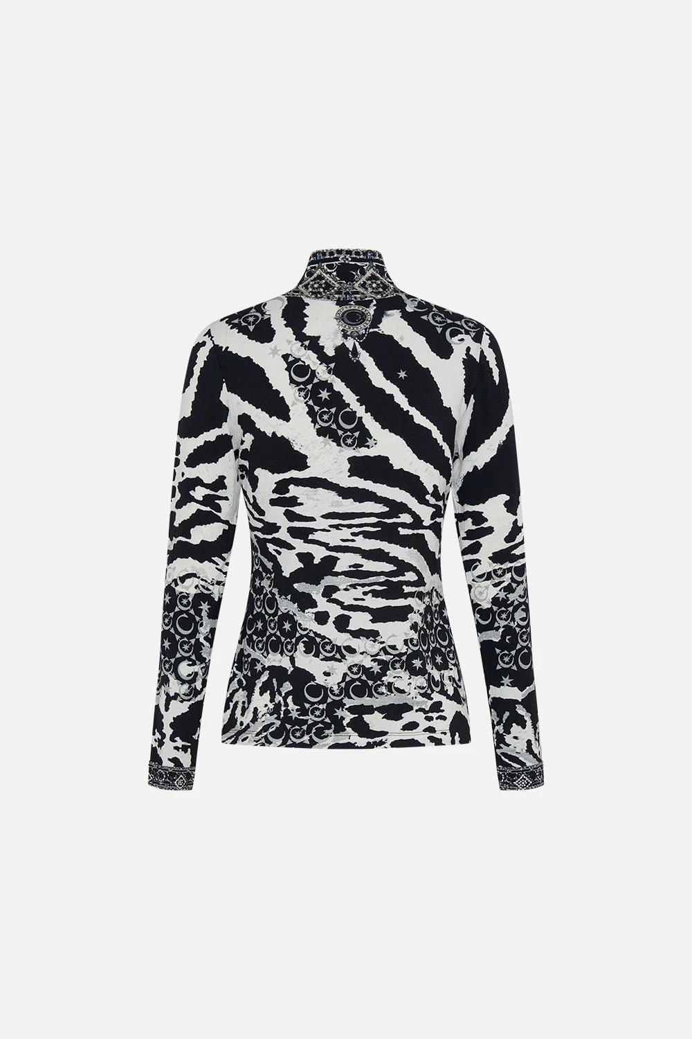 The Feline Fantasy Jersey Turtleneck encompasses the sultry mood of the sleek and seductive feline shadows wildly embracing their contrast patterns and making their monogrammed marks. The ultimate in lightweight layering, this luxury jersey turtleneck features a full length sleeve , a fitted bodice that hugs the waist and curves, a high neckline that flows into a silhouette that falls effortlessly to the hip. Lovingly handcrafted and designed in Australia, explore more from The Moral Of The Story: Act II collection.