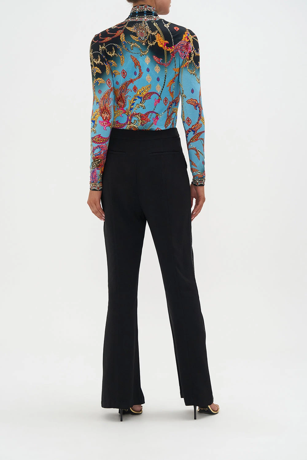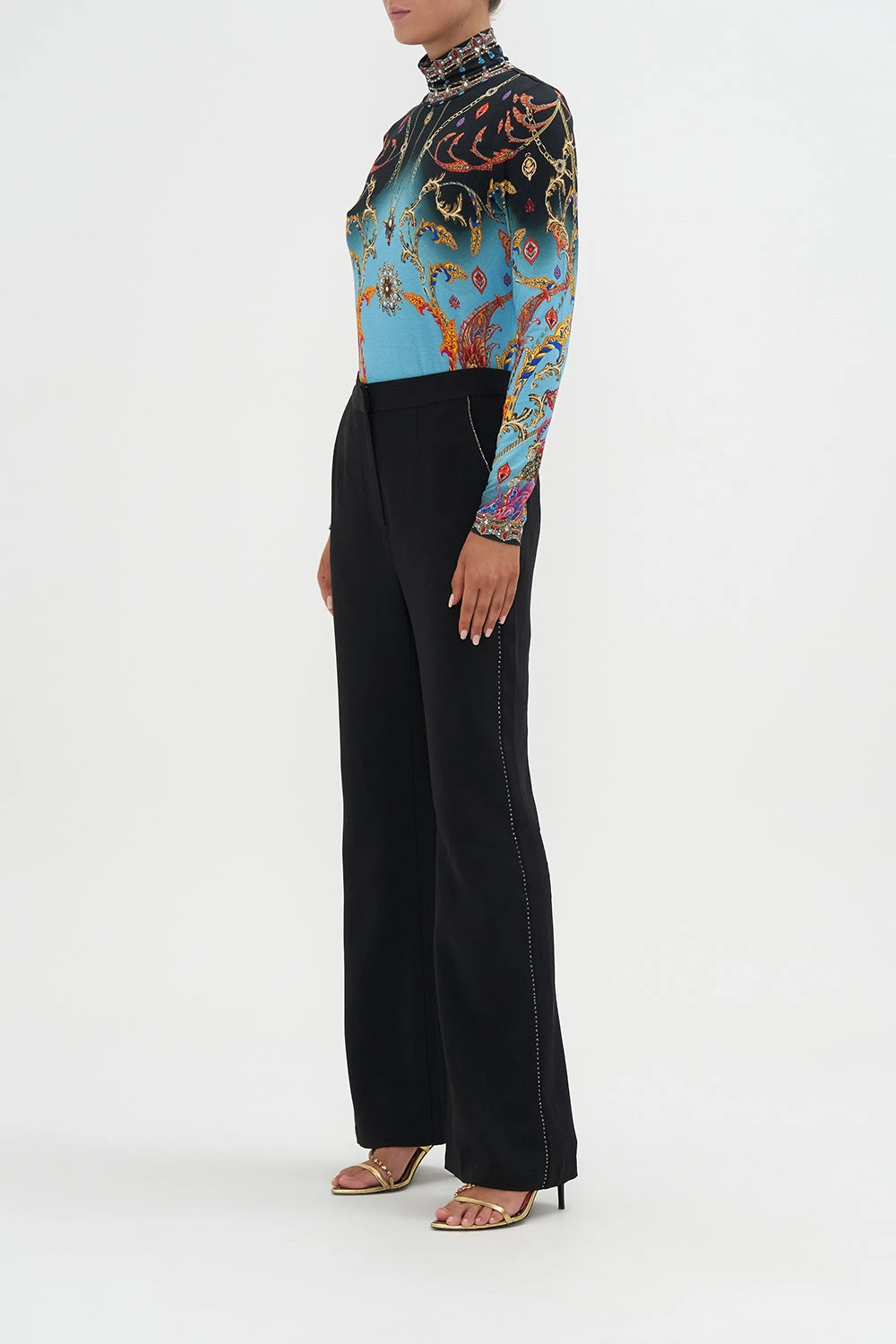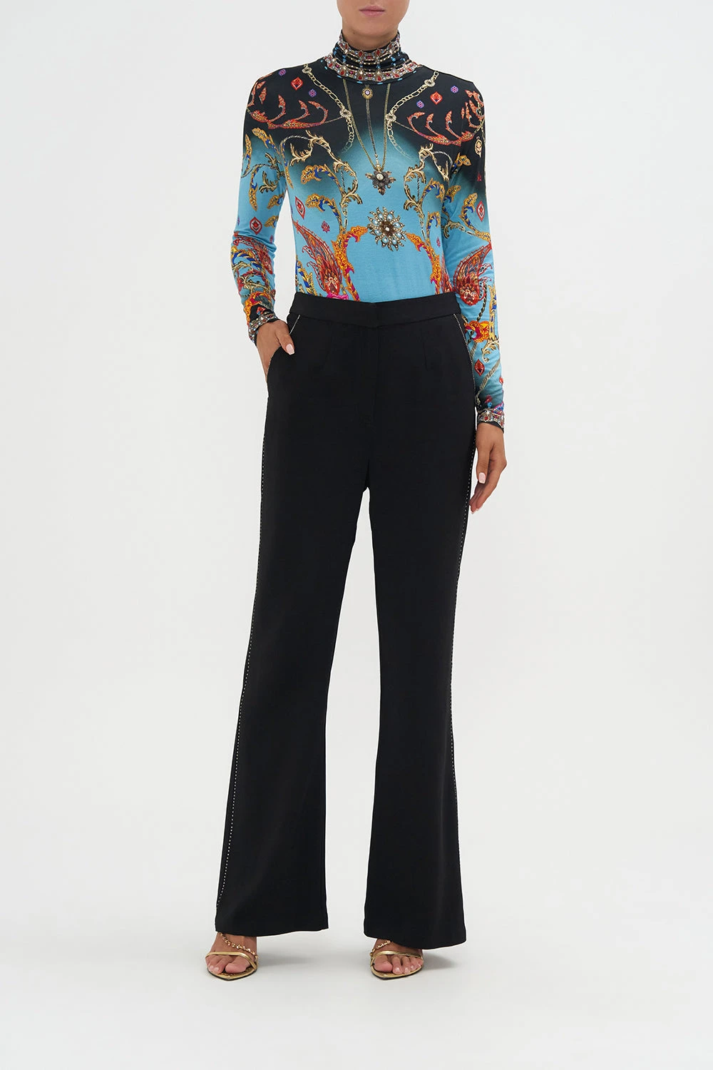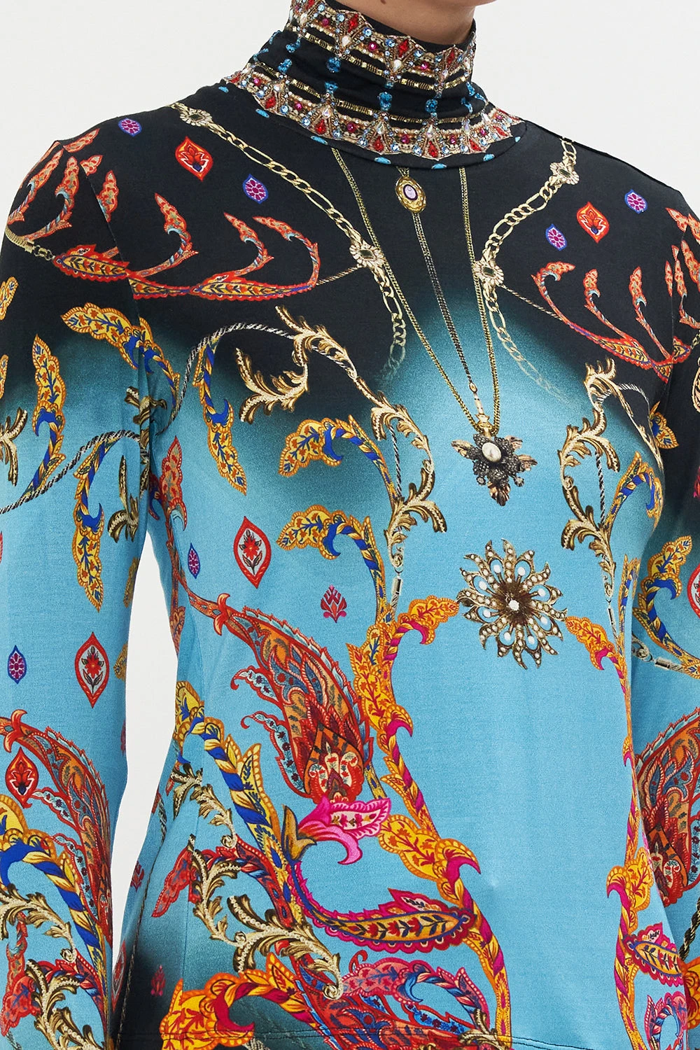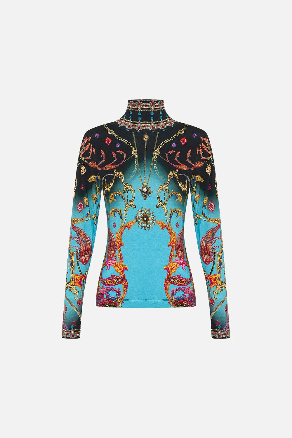 The What Lies Beneath Jersey Turtleneck welcomes the eye to paradise with a sky blue hue graced with paisley patterns dipped in raspberry tones, gold baroque details and a soft gradient that falls into shades of lavender.