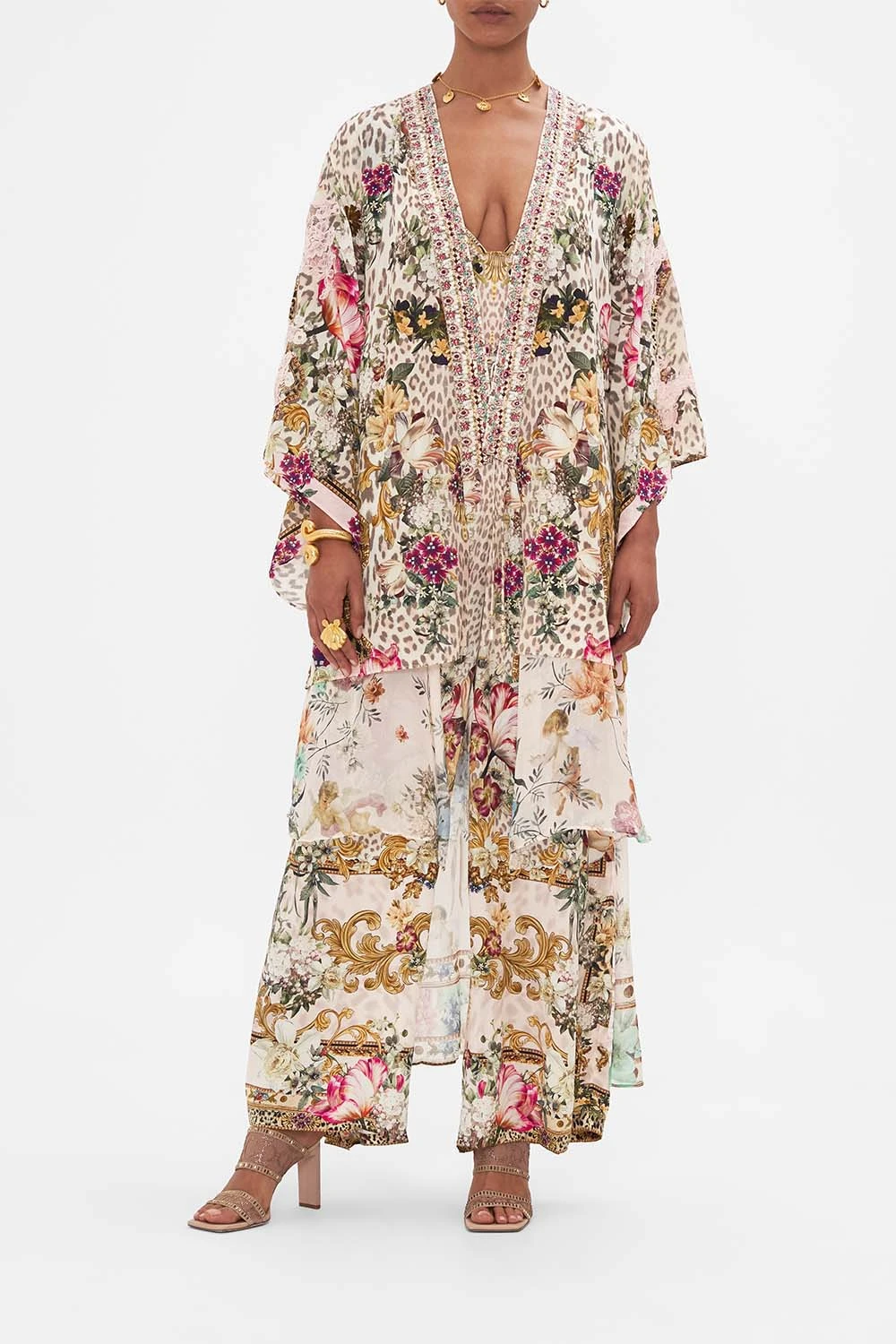 The Bambino Bliss Kimono With Long Underlayer echoes the sweet symphony pastel pinks awashed in opulent florals and lavish leopard print dancing beneath gilded archways. This statement CAMILLA silk kimono plays host to a high-low hemline that falls to ankle length, a contrast panel neckband adorned in CAMILLA crystals and a wide kimono sleeve. Lovingly handcrafted, designed in Australia. Explore more from the Amore Mio collection.