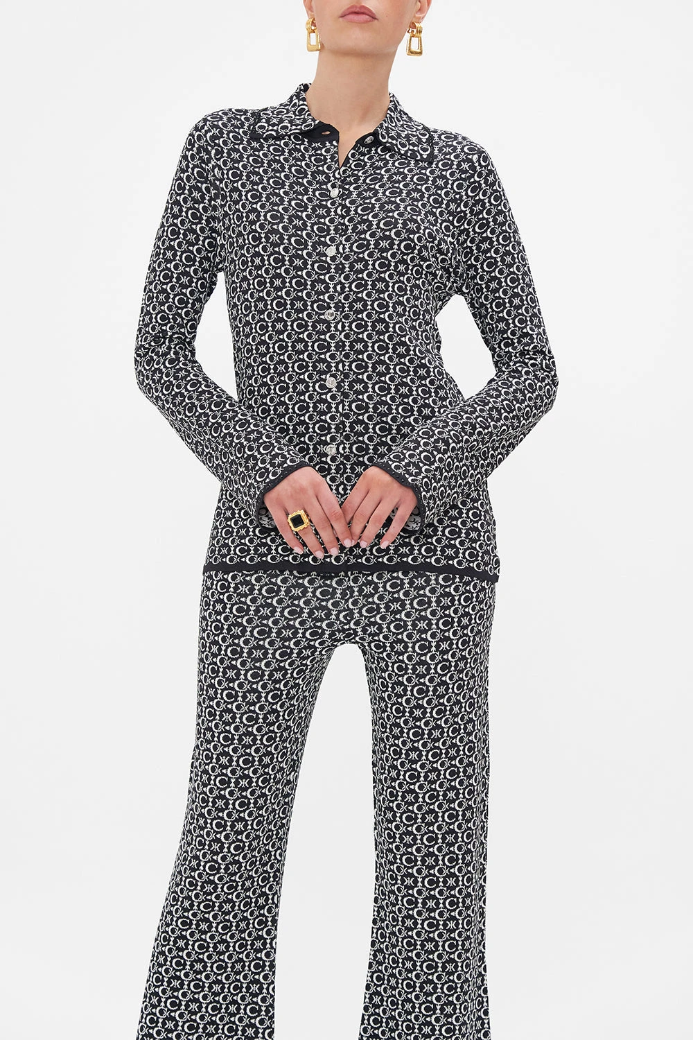 The Feline Fantasy Knit Shirt encompasses the sultry mood of the sleek and seductive feline shadows wildly embracing their contrast patterns and making their monogrammed marks. Crafted from fully fashioned soft rayon blend, this luxury knit shirt offers odes to soft tailoring at the collar, a sensational flared sleeve that dances at the wrist and a relaxed slimline silhouette that skims the curves, finished with a decadent button enclosure. Lovingly handcrafted and designed in Australia, explore more from The Moral Of The Story: Act II collection.