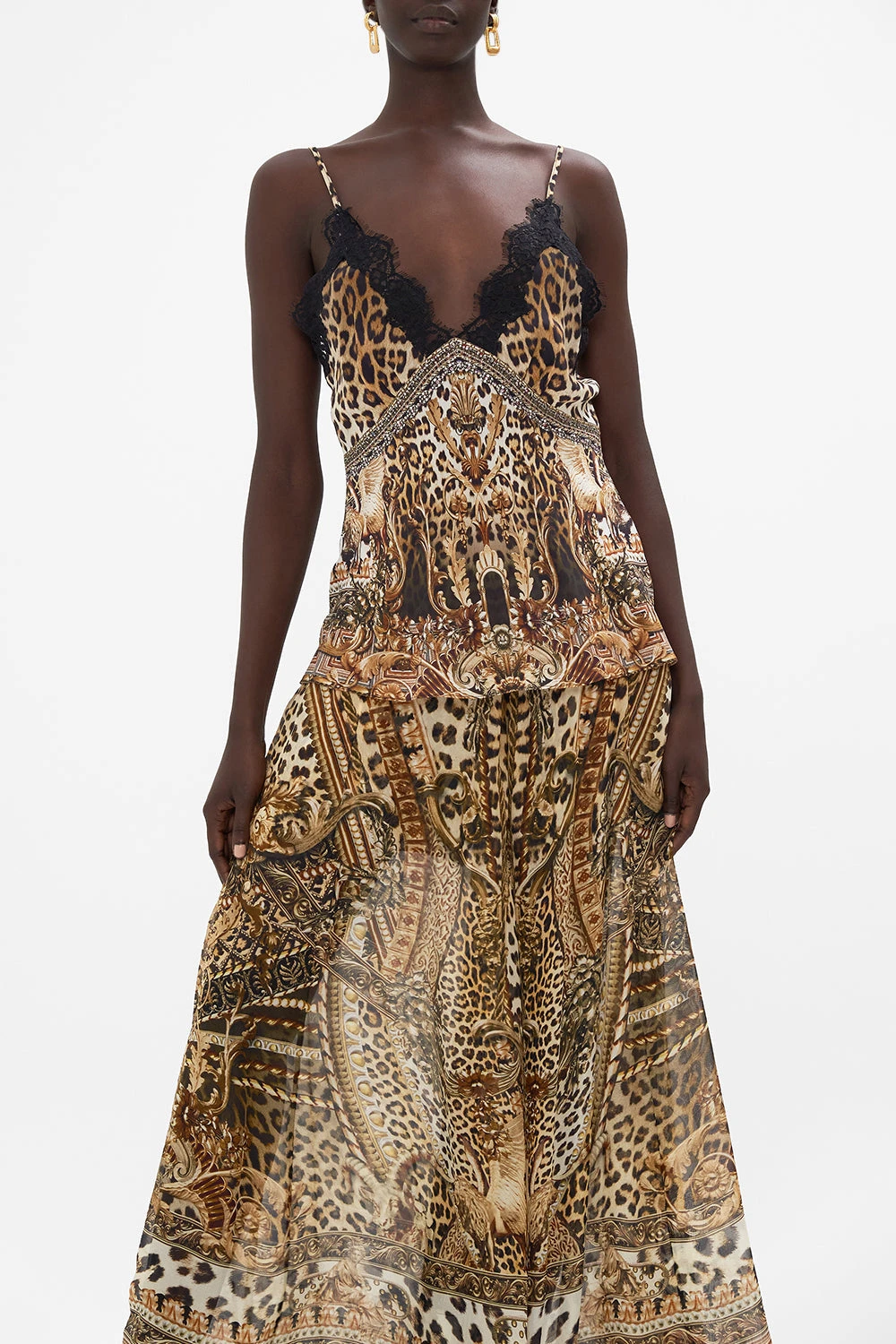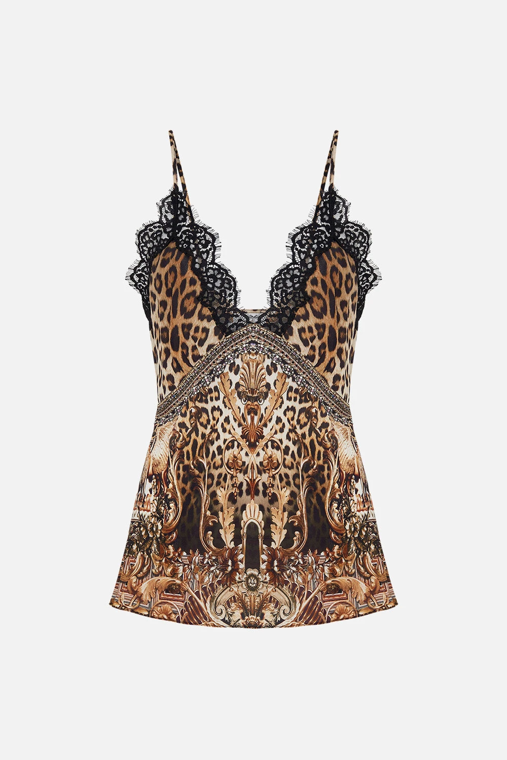 The Standing Ovation Lace Edge Cami captures the unbridle inspirational spirit of the infamous Teatro alla Scala through a rhapsody of rich leopard print. Complete with CAMILLA crystals, this luxury silk cami plays host to delicate black lace inserts at the neckline, adjustable shoestring straps, side splits and a relaxed silhouette. To create a chic co-ord outfit pair with the Standing Ovation Sheer Wide Leg Pant. Lovingly handcrafted, designed in Australia. Explore more from the Amore Mio collection.