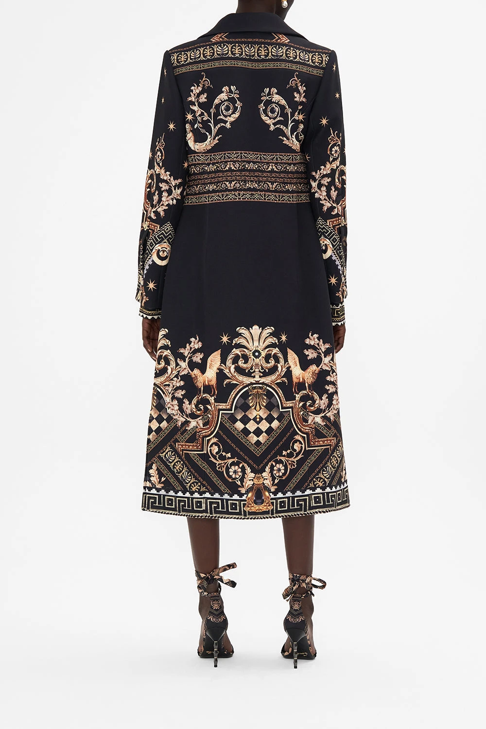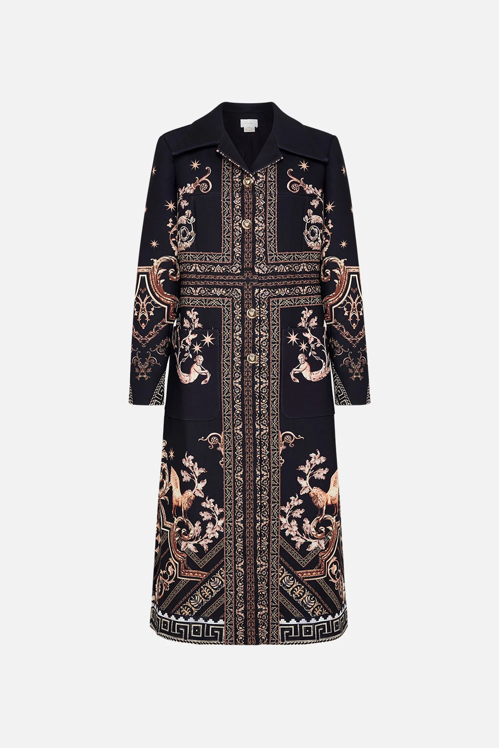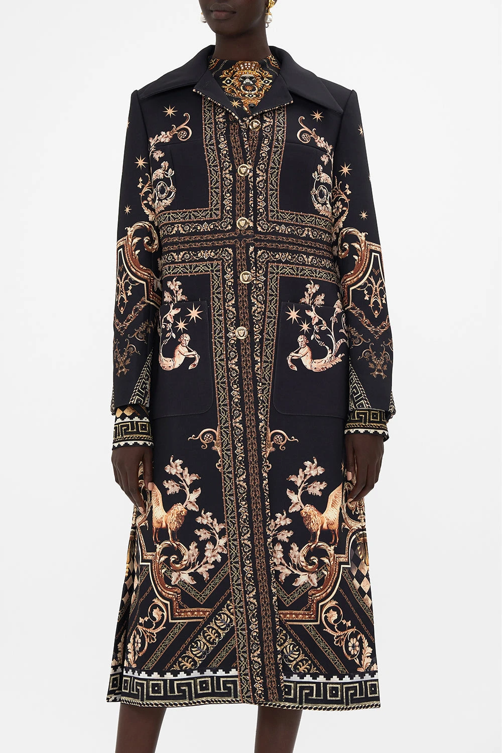 The Duomo Dynasty Long Button Front Coat is a symphony of grand palatial curves. A striking mosaic of onyx and gold highlights the glimmering gold charms and royal crests imbued in myth and magic. Make a bold statement with this luscious longline printed coat featuring a single breasted custom button enclosure, fully lined, contrasting front patch pockets and sculpted lapels to elevate and accentuate the structured silhouette. The ultimate in luxe layering, an opulent outerwear piece. Lovingly handcrafted, designed in Australia. Explore more from the Amore Mio collection.