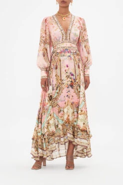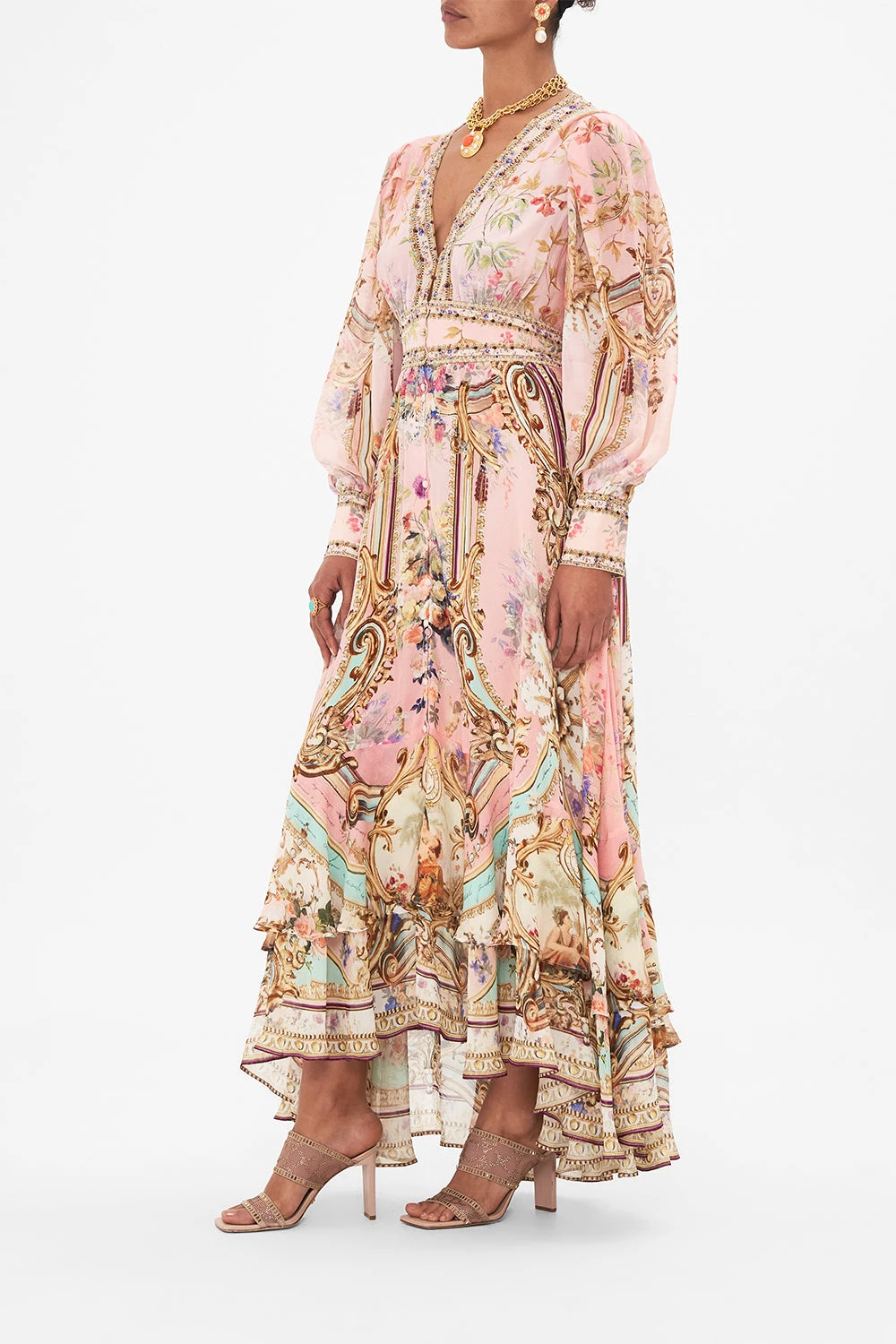The Letters From The Pink Room Long Button Front Dress depicts an atmosphere of soft pink with turquoise highlights amongst a world of pretty blooms and golden filigree. Adorning CAMILLA crystals, this luxury silk occasion dress features soft blouson sleeves, a deep v neckline, a shaped waist with button front enclosure and an elegant maxi hemline that falls into exquisite tiered frills. A show stopping formal dress designed to steal the spotlight. Lovingly handcrafted, designed in Australia. Explore more from the Amore Mio collection.