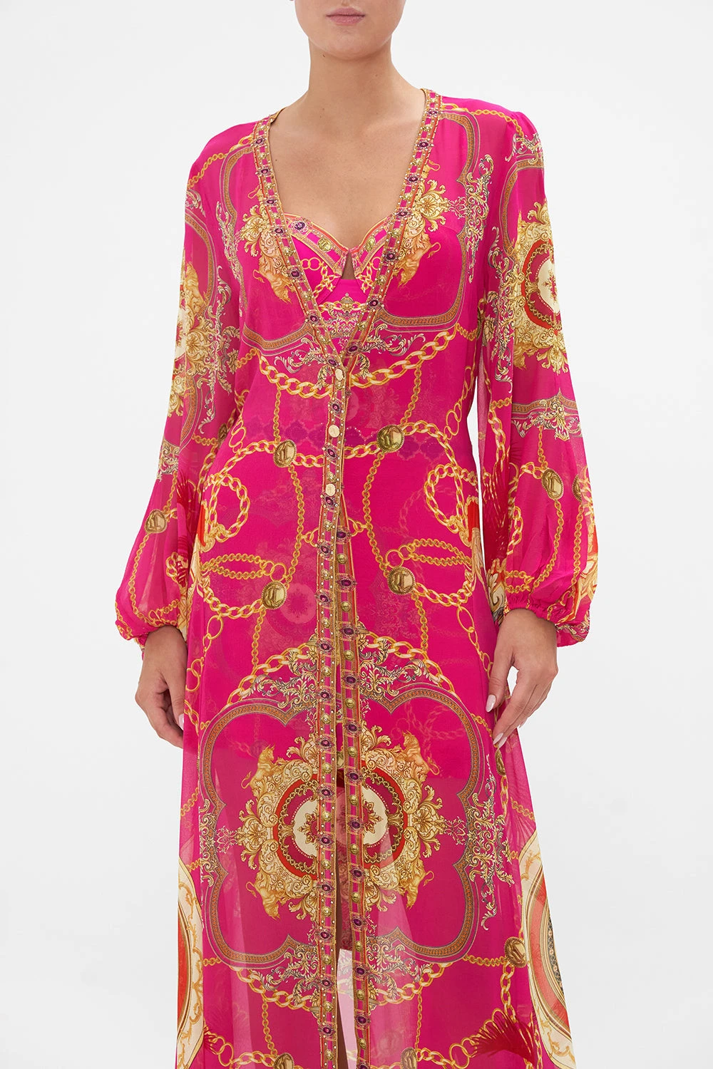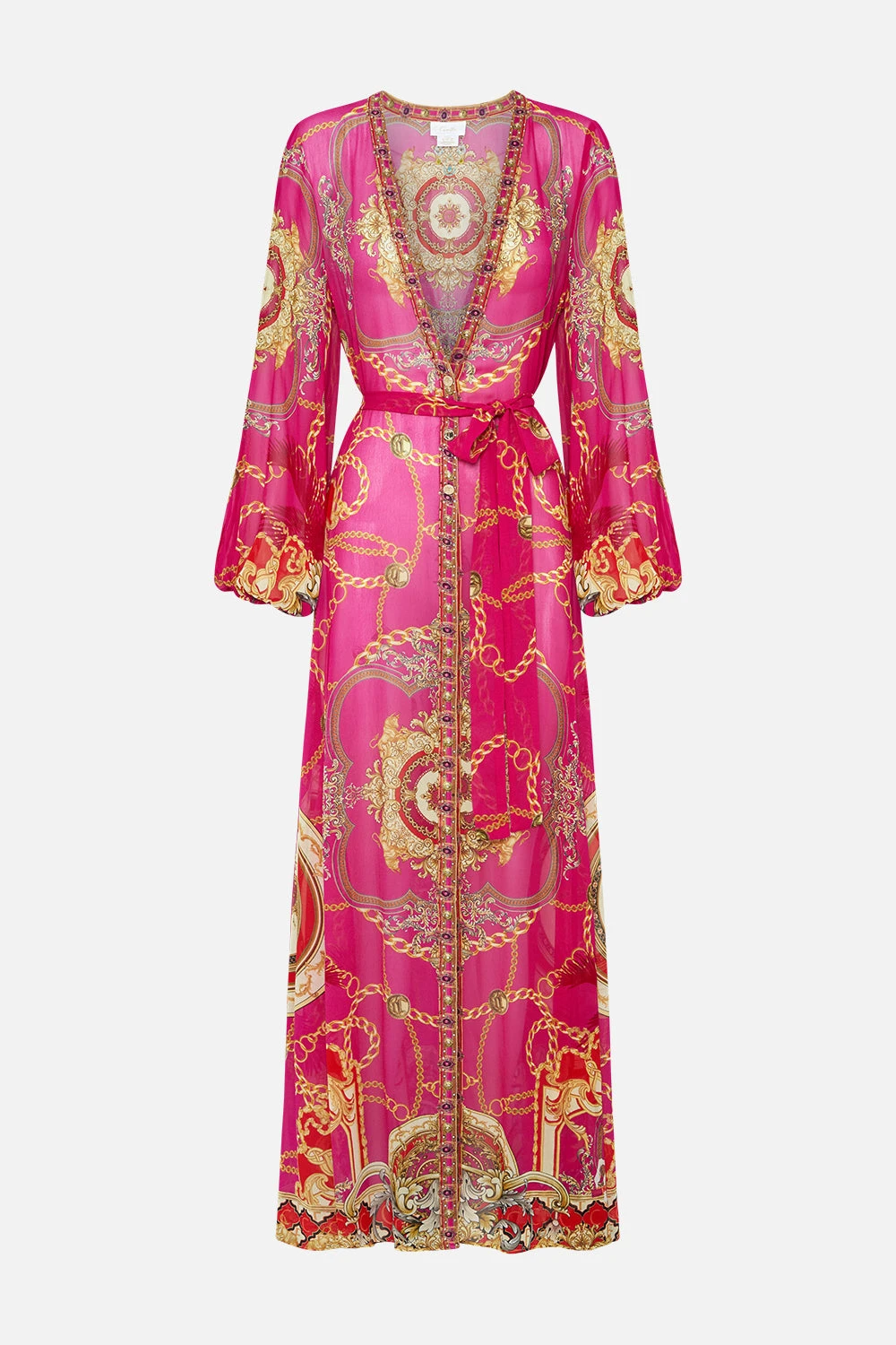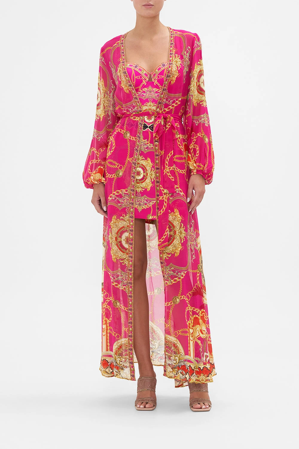 The Wild & Running Long Romantic Layer evokes a striking palette of fuchsia and red .Sleek curved lines dance gracefully within bold mosaic borders. Gold flourishes entwine with fronds of scarlet palms and decadent layers of glistening gold chains. Strikingly dramatic, this luxuriously sheer silk layering piece is home to hand-embellished signature CAMILLA crystal details, waist tie to cinch and shape, button front enclosure, dramatically billowy blouson sleeves and a maxi length in a relaxed fit silhouette. Lovingly handcrafted and designed in Australia, explore more from The Moral Of The Story: Act II collection.