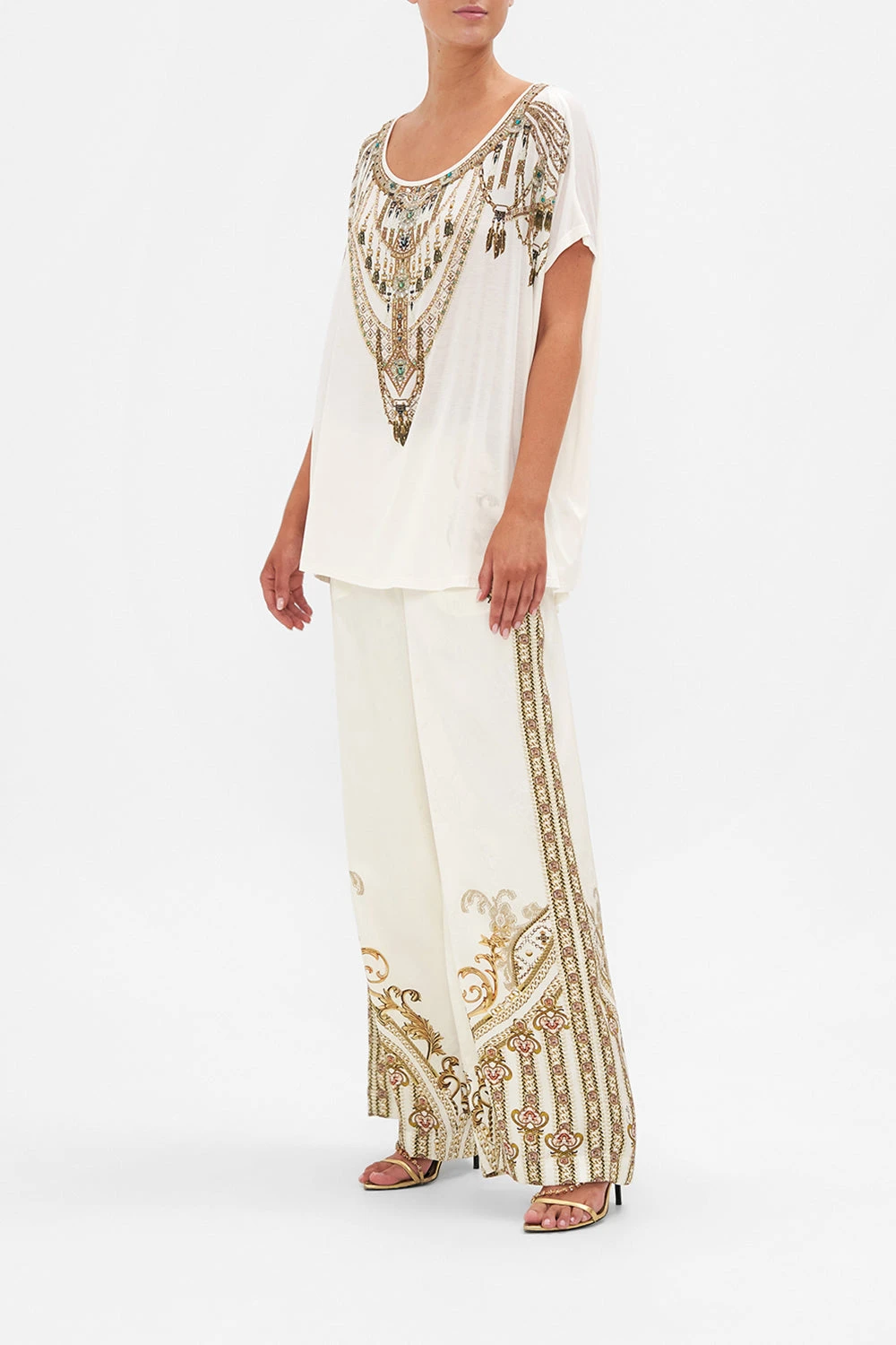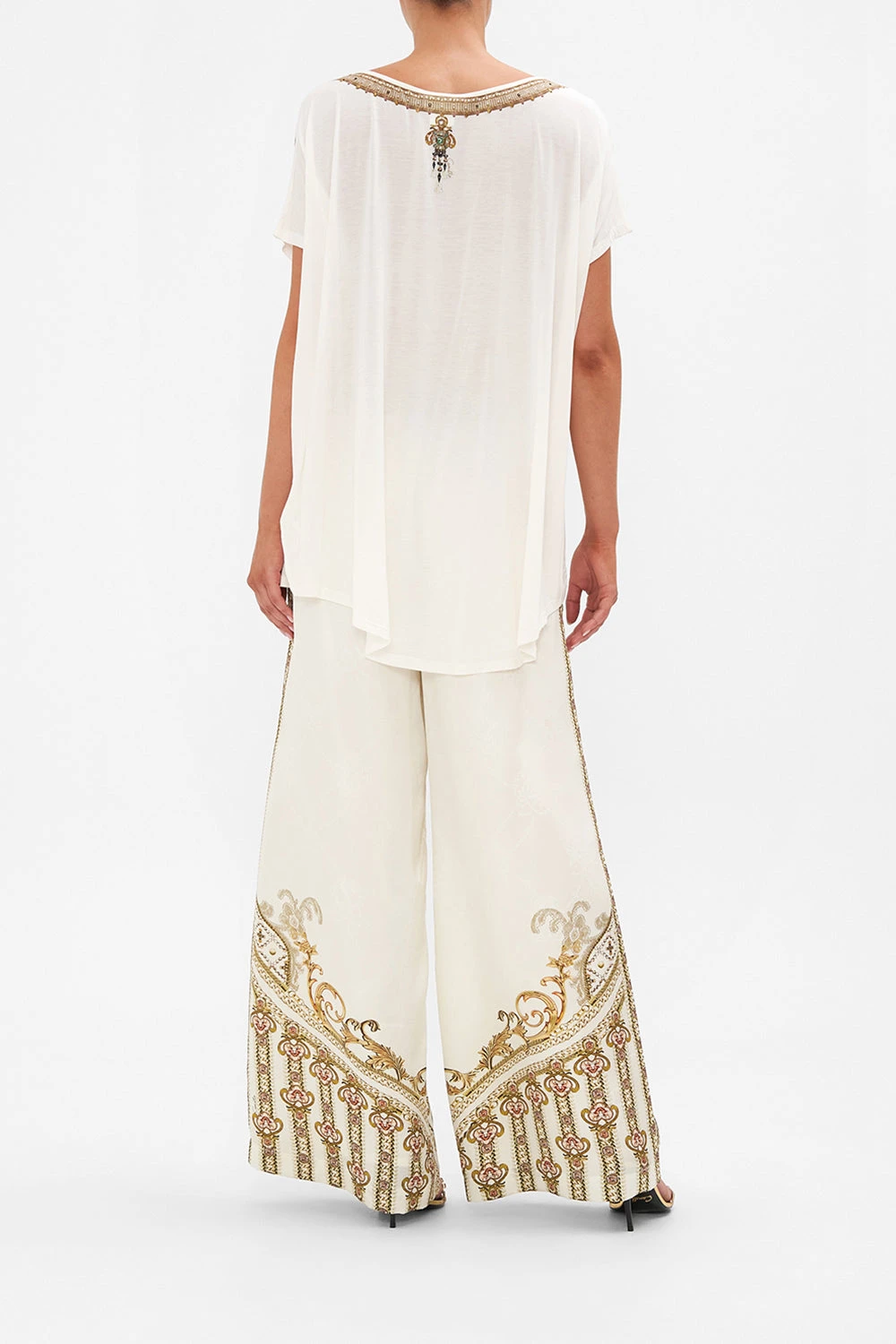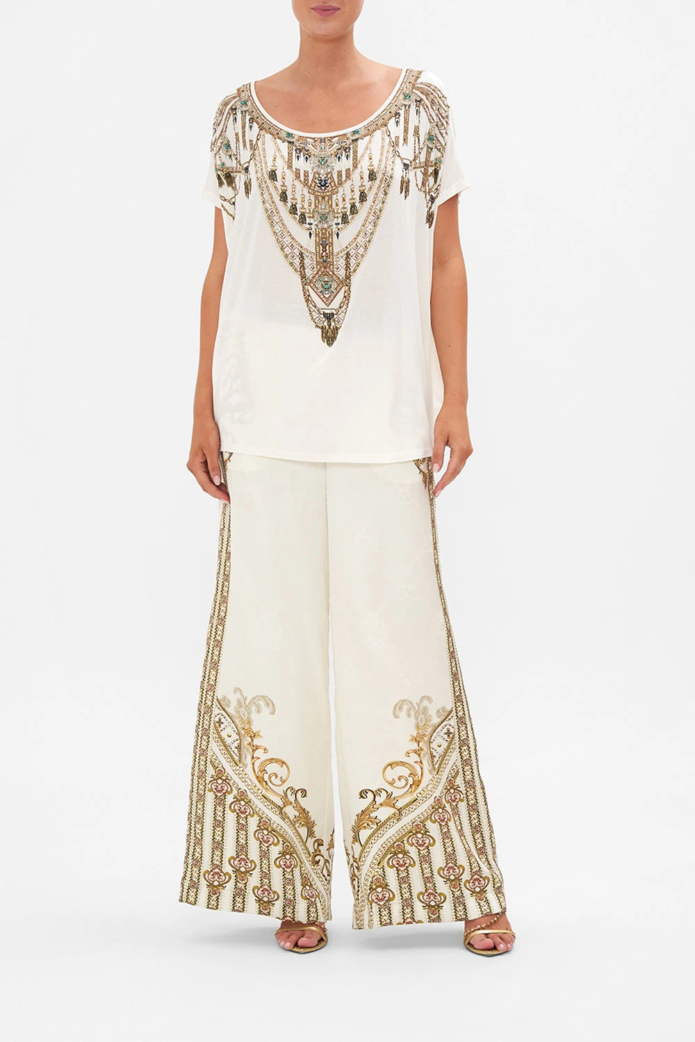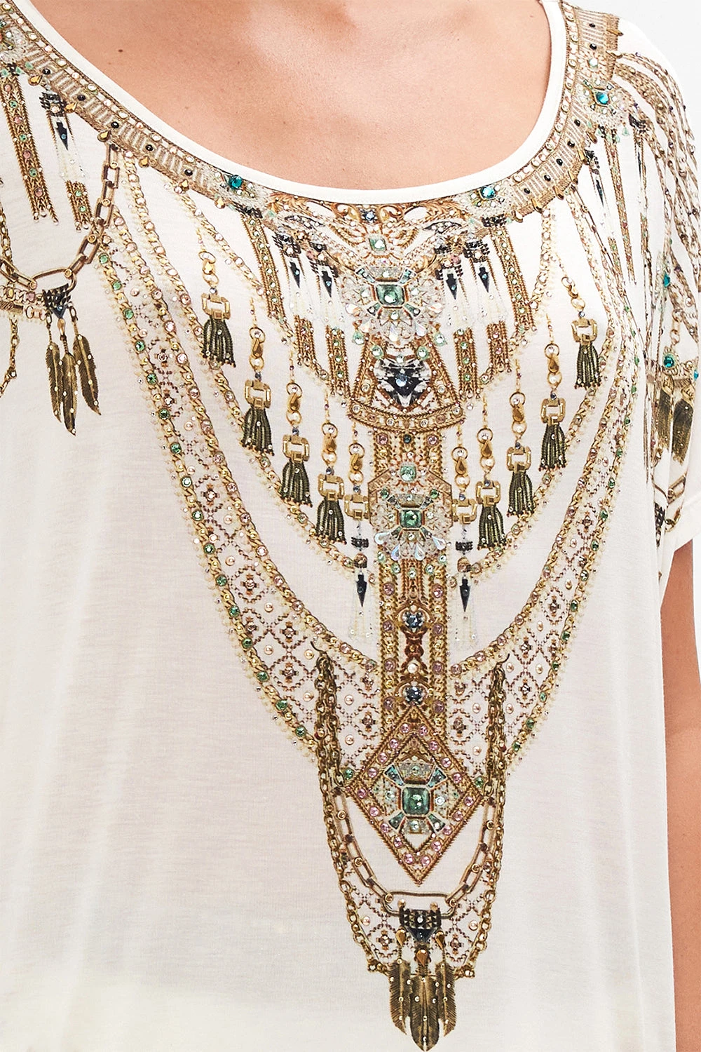 The Soar Like An Eagle Loose Fit Tee elevates the everyday with an ivory dreamscape defined by cascades of rich golden chains, lavish baroque detailing that floats amidst bronze tassel accents and pearlescent amulets dipped in ethereality. Crafted with hand-embellished CAMILLA crystals, this luxury tee is home to a generous round neckline that falls into a relaxed silhouette, cropped sleeves and a shaped high-low hemline.