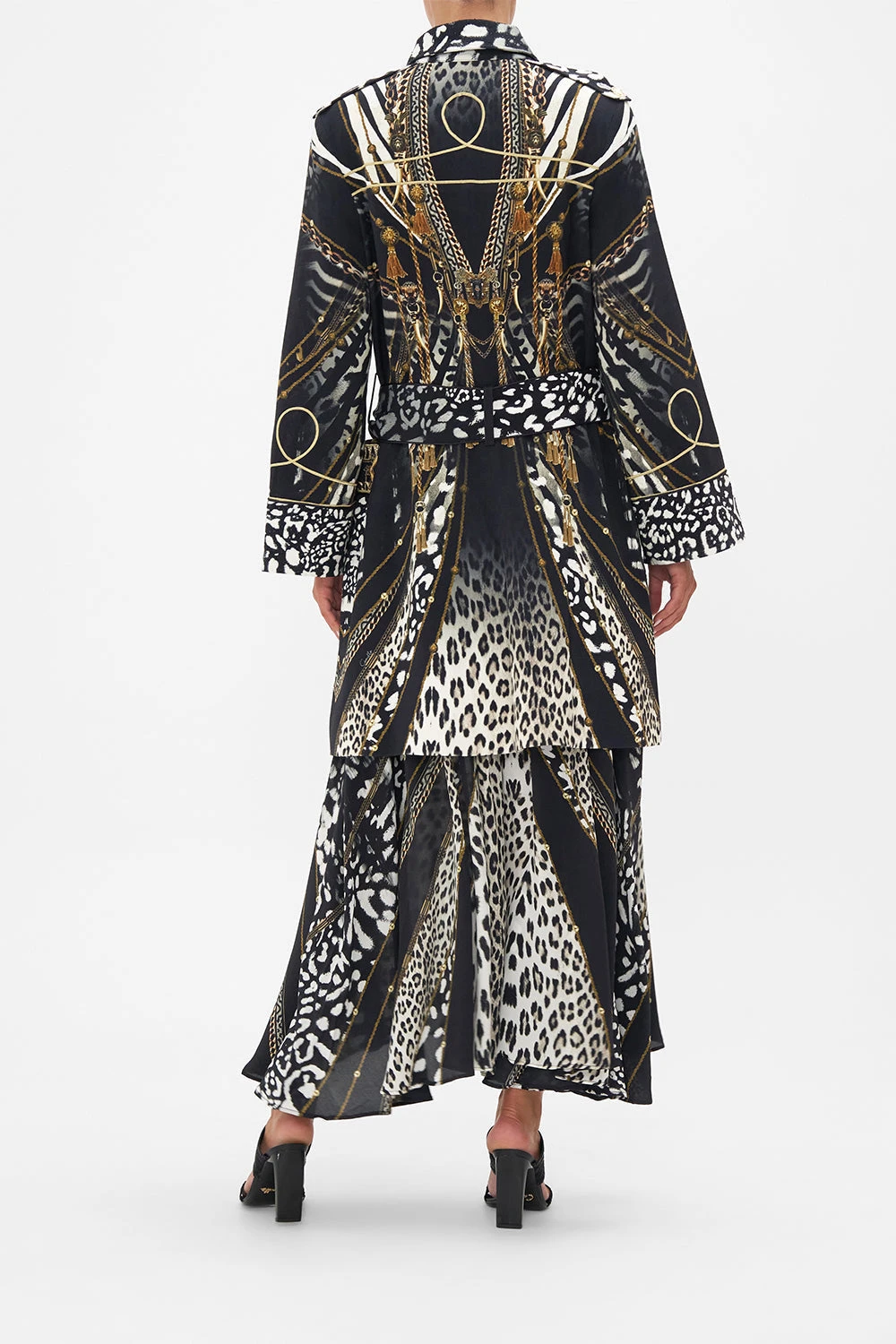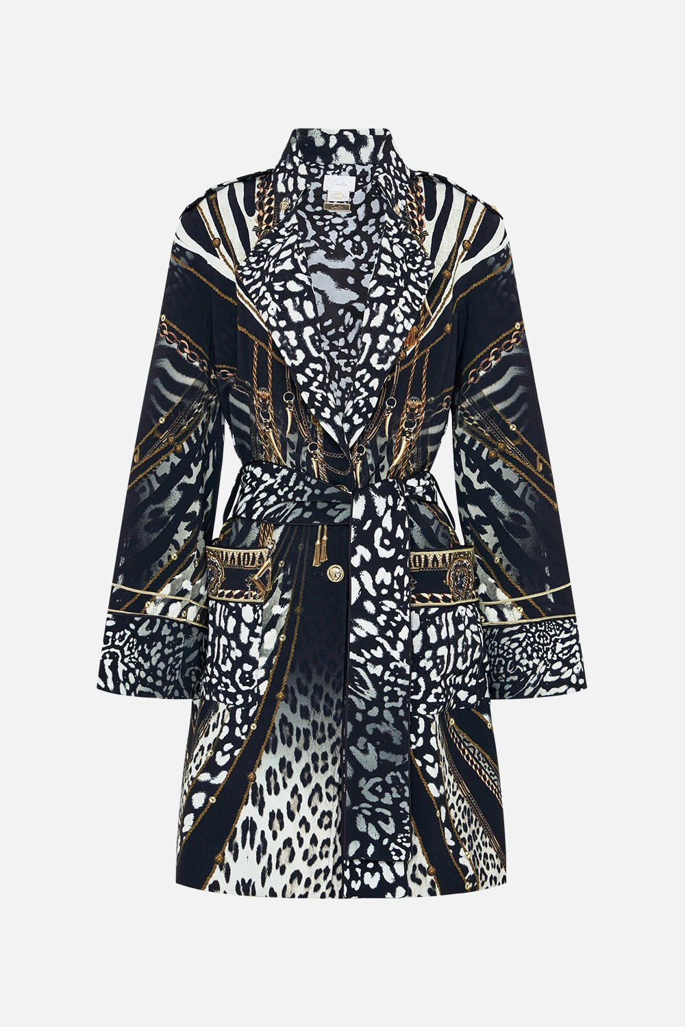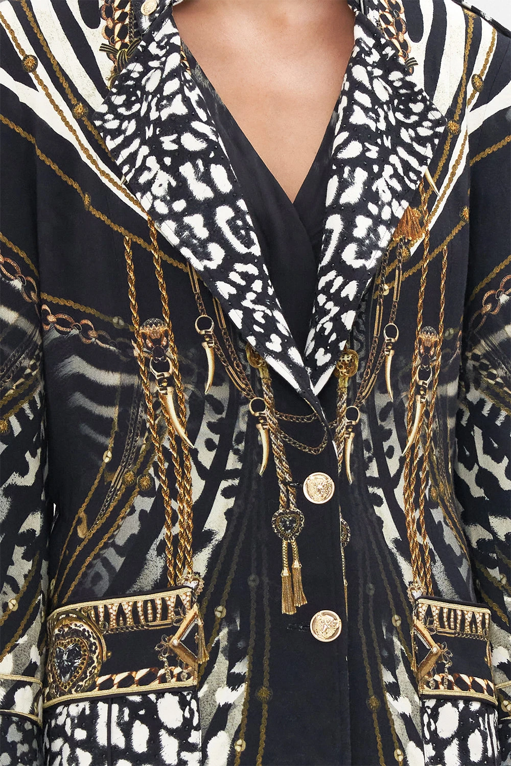 The Untamed Royalty Mid Length Military Coat draws back a lavish curtain of wild animal patterns elegantly embellished with gold chains. Luxurious lengths of silky rope and tassels adorned with trinkets and charms that dance amongst the shadows. Crafted from rich viscose crepe, this luxury military coat features custom-designed jacquard, hand-embellished CAMILLA crystals, contrasting black lapels and cuffs, matching waist-tie to cinch and shape, sleek epaulets adorn the structured shoulder for elevated sophistication. Lovingly handcrafted and designed in Australia, explore more from The Moral Of The Story: Act II collection.