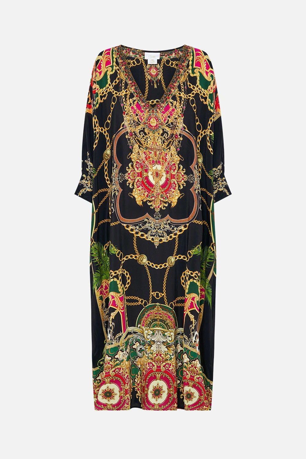 The Jealousy & Jewels Midi Kaftan With Cuff commands a rhapsody of elegantly curved formations framed with geometric mosaics. Gilded regal crests and equestrian motifs delicately intertwine with a net of gold chains and vibrant emerald green foliage. Decadently adorned with hand-embellished crystals, this luxury silk kaftan features soft long sleeves that flow into cuffs, a deep v neckline, a wispy handkerchief hemline and a oversized relaxed fit silhouette for easy elegance and dramatic billow. Lovingly handcrafted and designed in Australia, explore more from The Moral Of The Story: Act II collection.