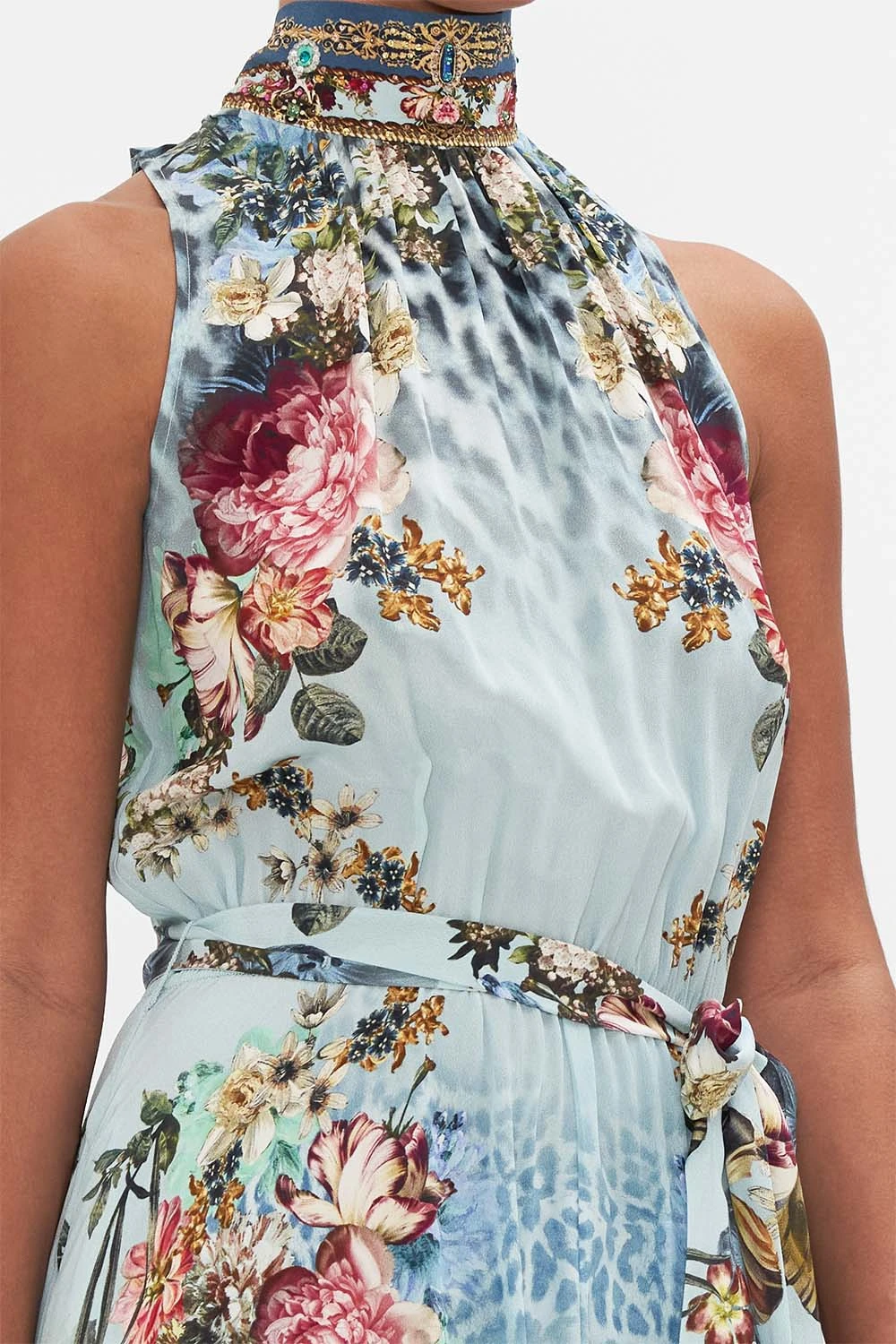 The Letters To Leo Necktie Dress With Elasticised Waist echoes the sweet symphony of frescoe blues awashed in opulent florals and lavish leopard. Crafted from signature CAMILLA silk, this luxury bohemian dress is home to a high neckline adorned in crystals, a shaped maxi hemline that meets a delicate ruffle and an elasticated waist to cinch and shape your silhouette. A stunning CAMILLA silk maxi dress designed to be worn as a sophisticated sundress or as elevated evening wear. Lovingly handcrafted, designed in Australia. Explore more from the Amore Mio collection.