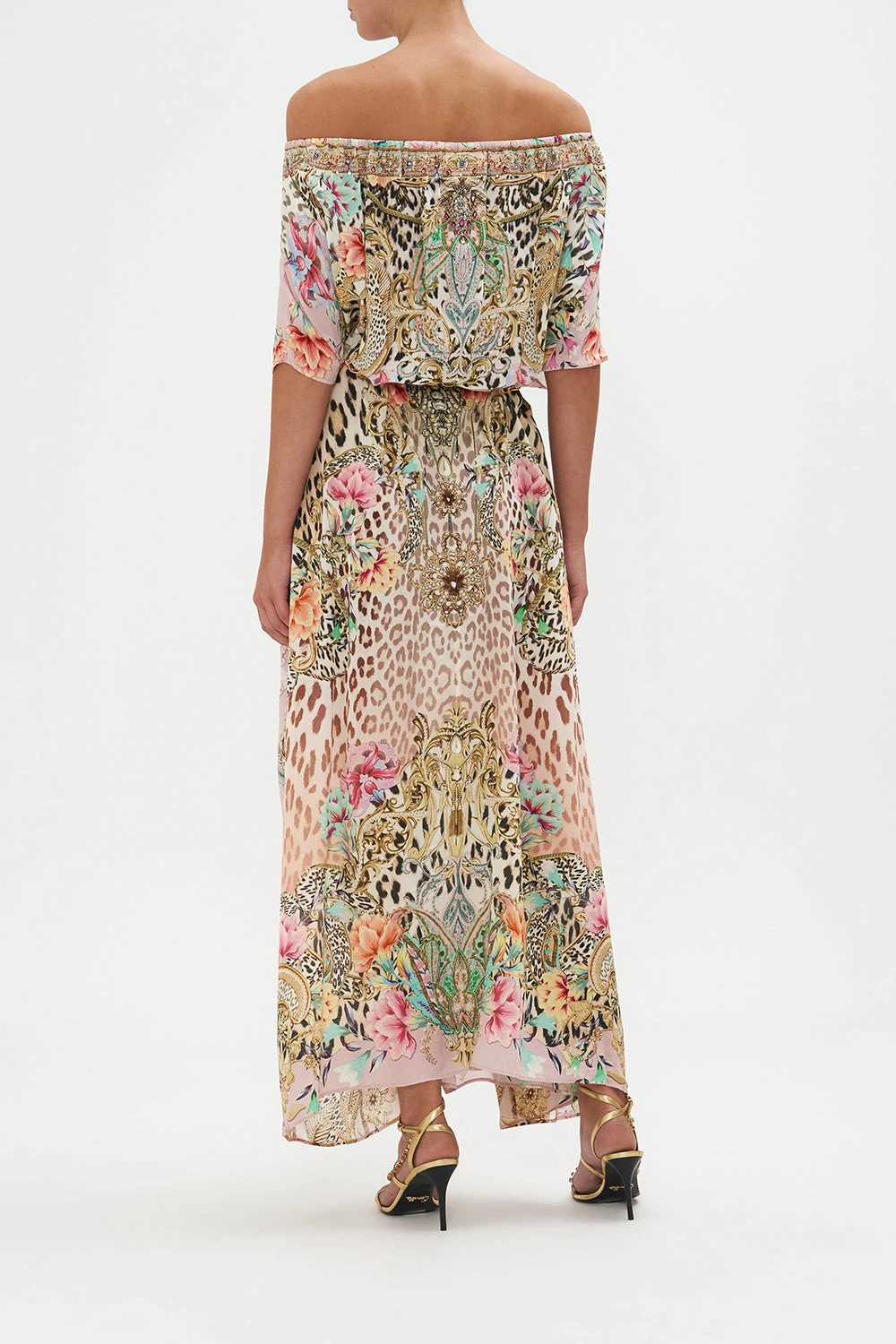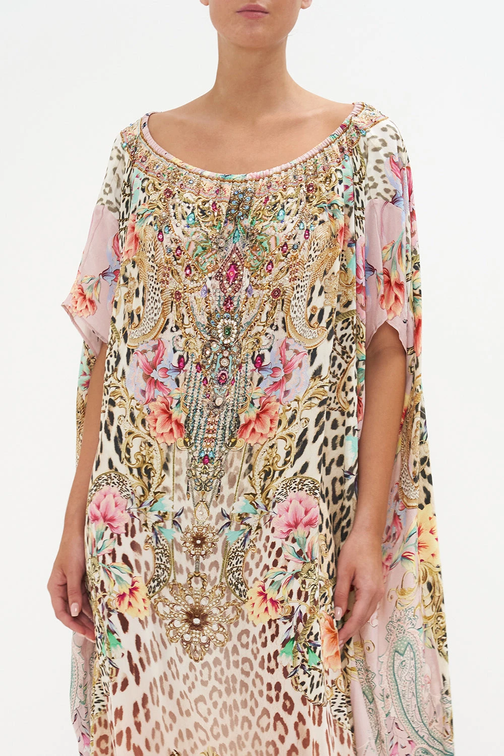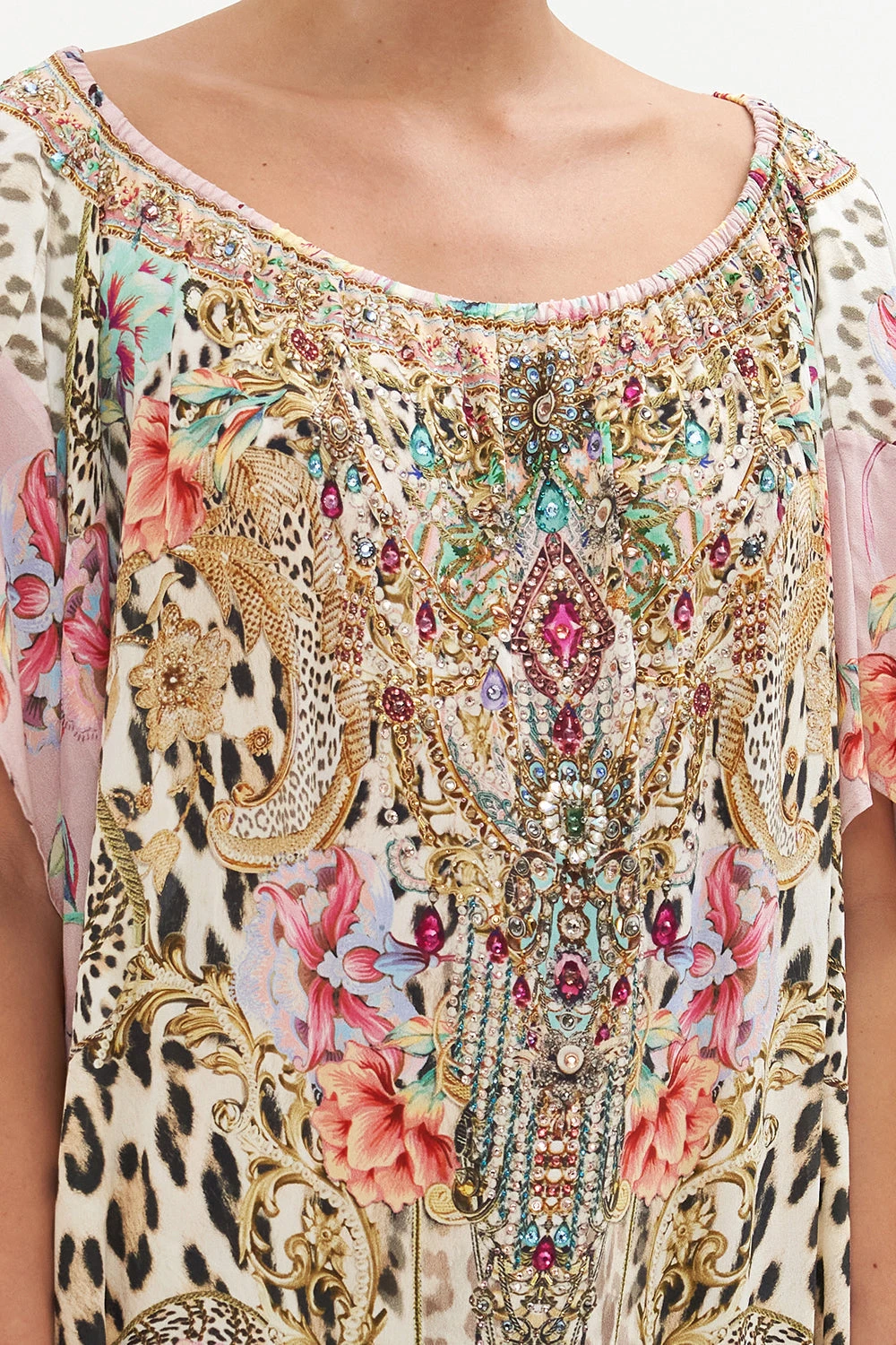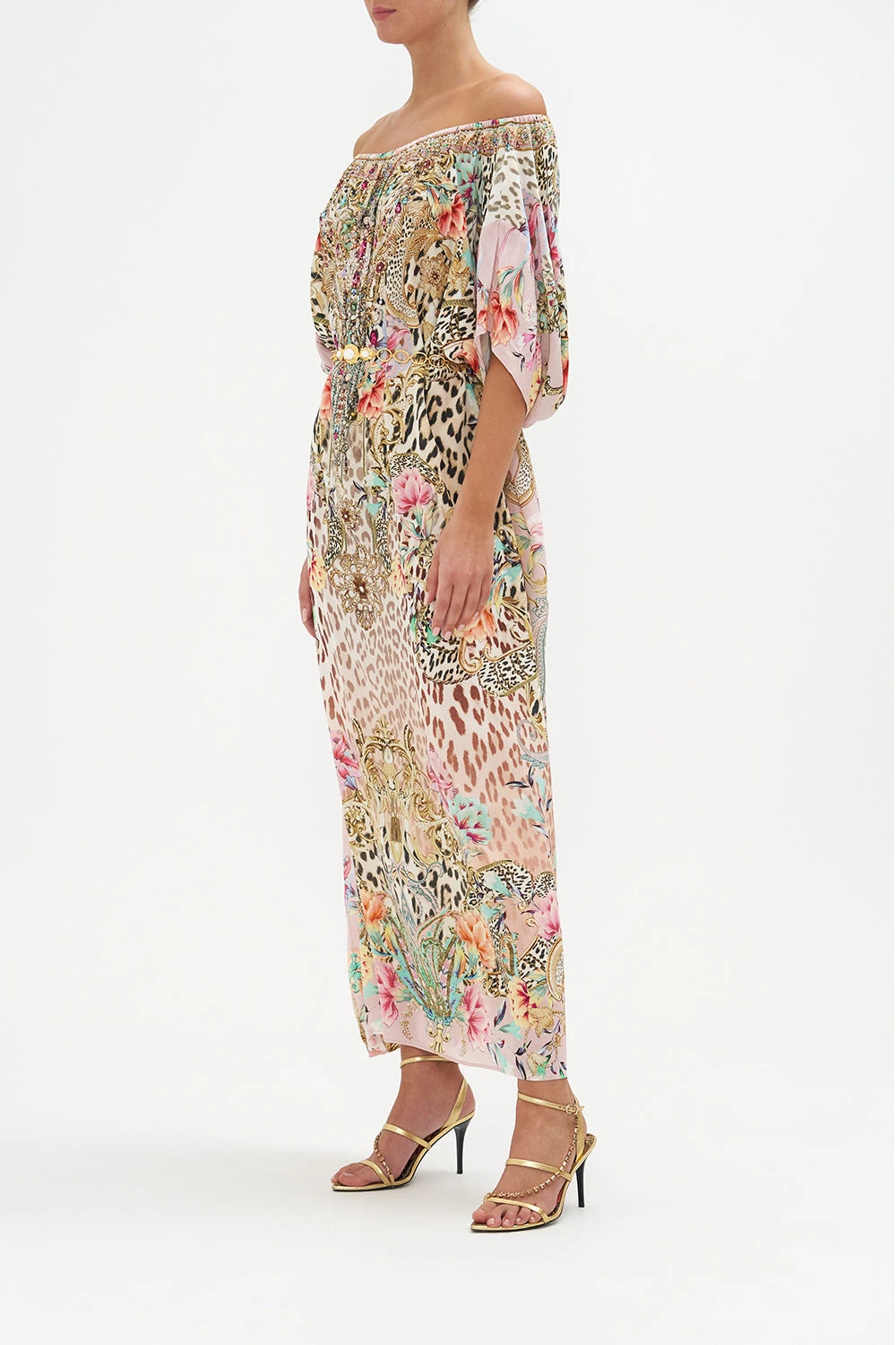 The Queen Atlantis Off Shoulder Kaftan brings back a classic with timeless leopard print finished with petals dipped in blush hues, roped accents and gold baroque detailing. Crafted from signature CAMILLA silk, this luxury resort kaftan plays host to hand-embellished crystals that adorn an off-shoulder neckline, a relaxed silhouette offering a multi-wear design and cropped sleeves that dance at the elbows.