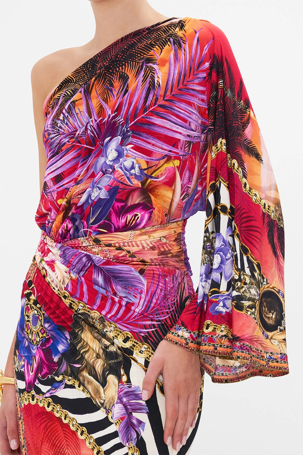 The Wild Loving One Shoulder Jersey Dress radiates the warm glow of a sunset paradise. where wilderness reigns amongst vibrant violet florals nestling against bold magenta palms, laced with intricate gold chains, charms and hints of sparkling amethyst jewels. Crafted for days or evenings defined by bliss and decadence, this luxury jersey dress features a wide one shoulder sleeve, twist detailing at the waist to cinch you in and a side split to give brief glimpses of the legs as hand-applied crystals glisten at the hip. Lovingly handcrafted and designed in Australia, explore more from The Moral Of The Story: Act II collection.