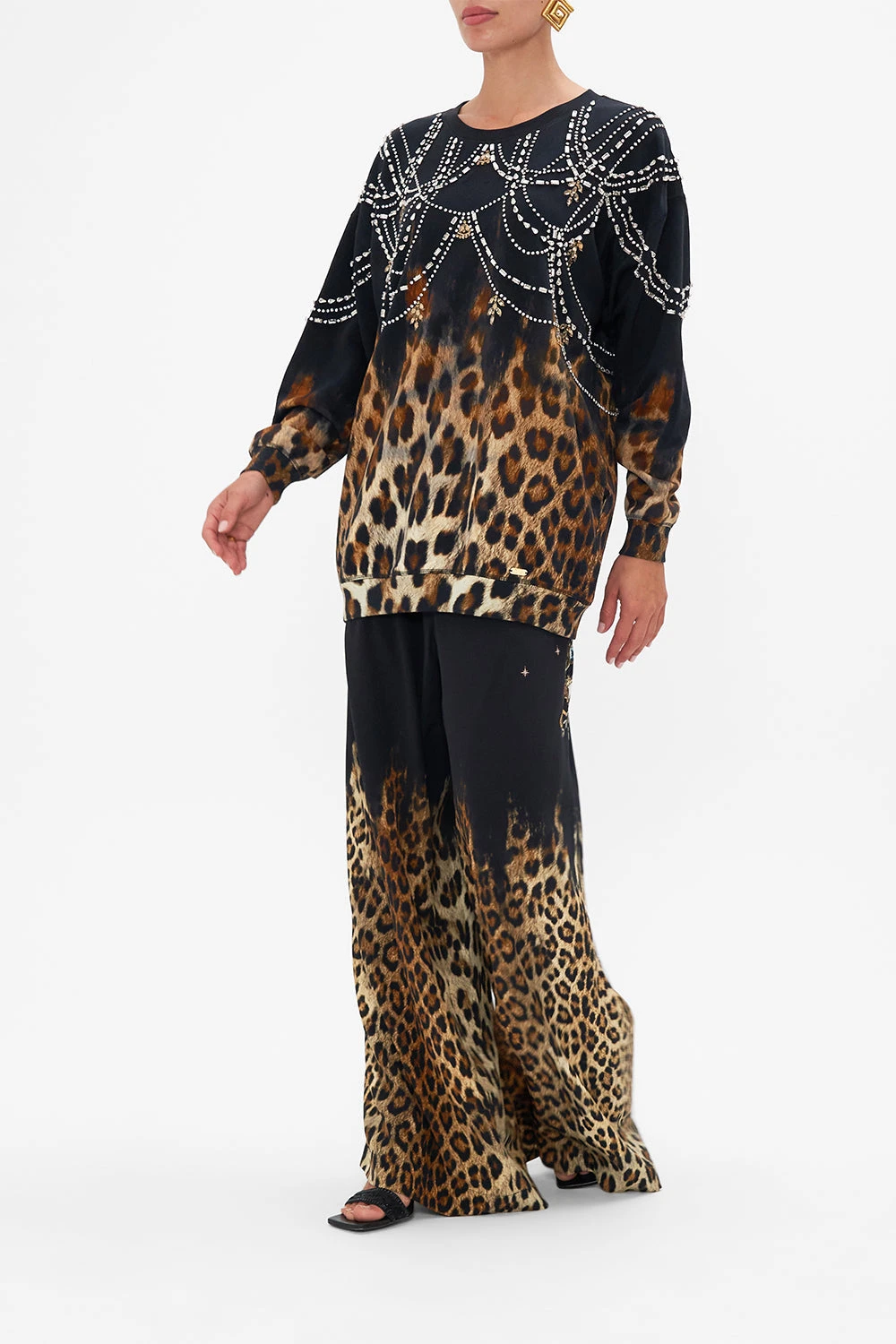 The Jungle Dreaming Oversized Sweater is a tantalising vision of wild animal and tribal inspired geo patterns melding in amongst an arrangement of glimmering chains, charms and topaz highlights. Adorning hand-embellished crystals, this luxury cotton sweater features a rounded neckline, drop shoulders, ribbed accents and a relaxed longline silhouette. Lovingly handcrafted and designed in Australia, explore more from The Moral Of The Story: Act II collection.