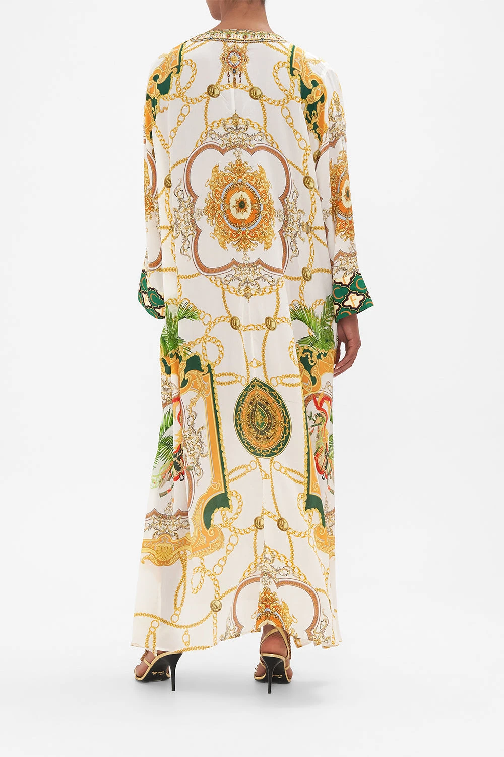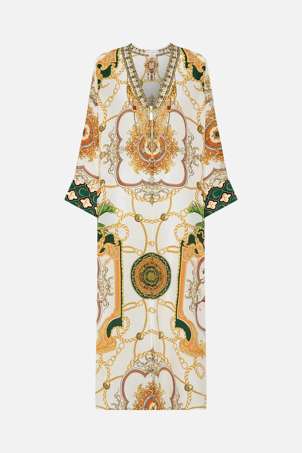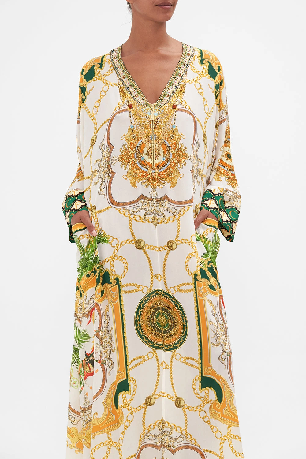 My Sweet Devotion Pocket Kaftan With Zip glides into a world of elegant palatial curves boldly outlined in geometric mosaics. Gold regal motifs dance in amongst lions and stallions, intertwined with golden chains and lush emerald green foliage against porcelain white. Complete with hand-embellished CAMILLA crystals, this luxury silk kaftan is designed for dramatic effect, featuring statement long sleeves that fall into wide banded cuffs, pocket functionality, a deep v neckline with front zip enclosure and a flowy oversized relaxed fit silhouette that falls into a maxi hemline with side splits for added flow and movement. Lovingly handcrafted and designed in Australia, explore more from The Moral Of The Story: Act II collection.