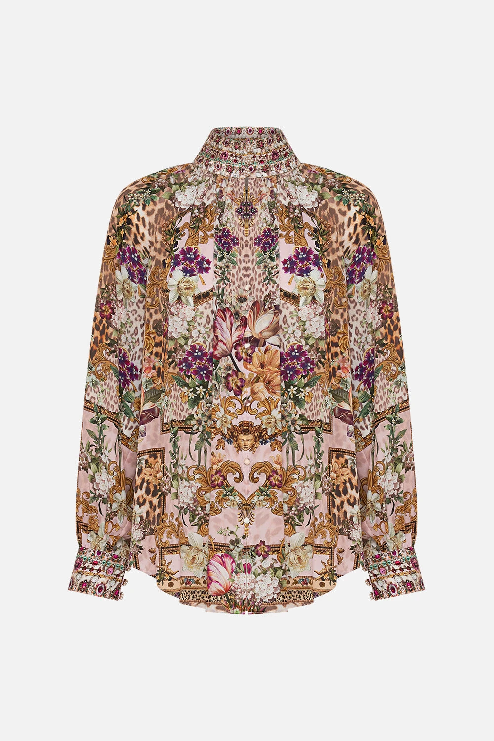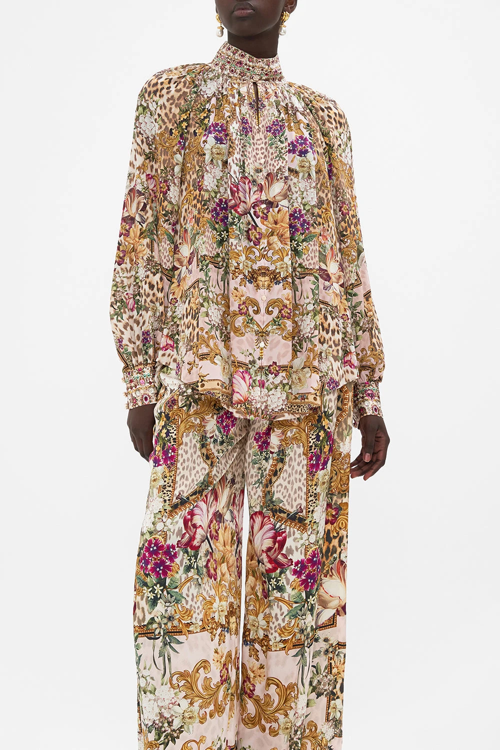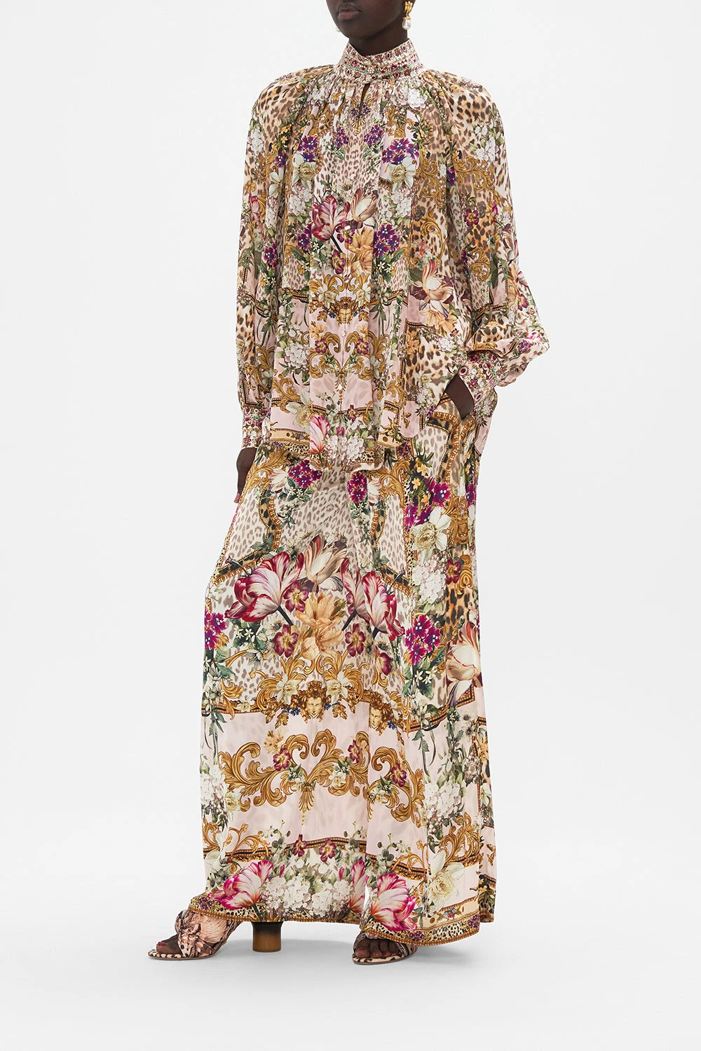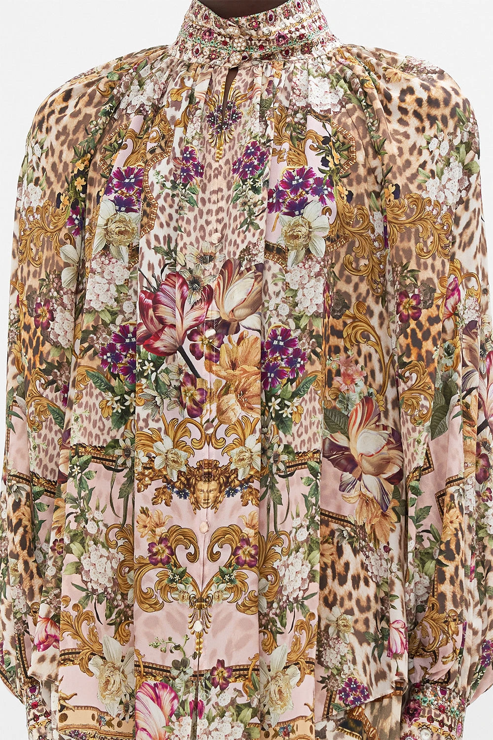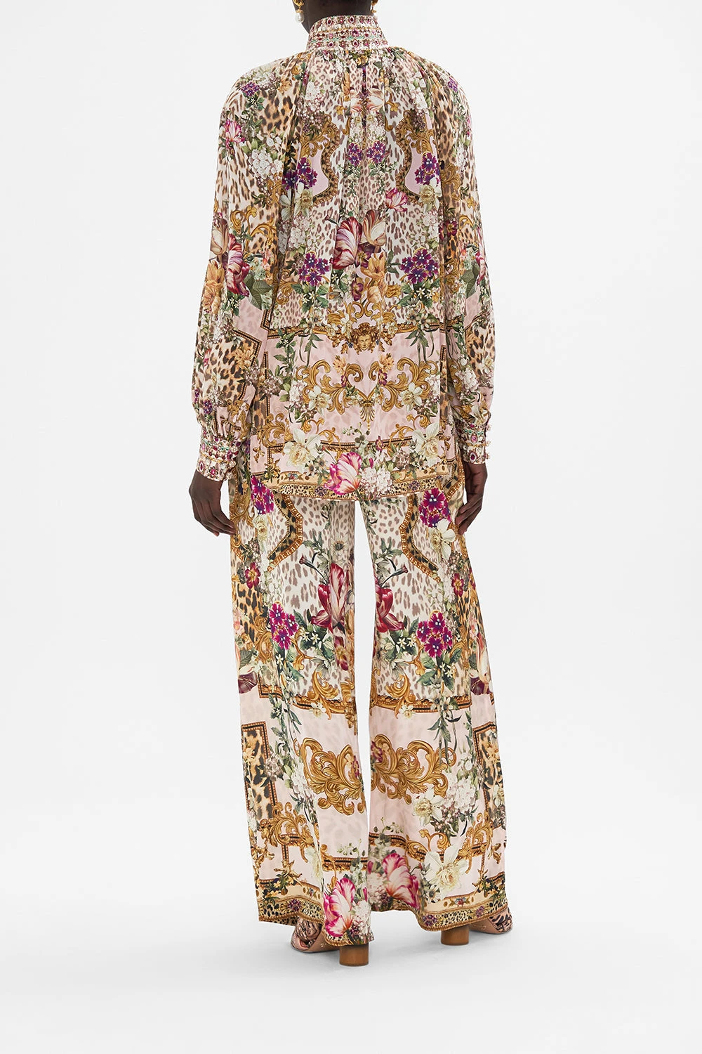 The Bambino Bliss Raglan Button Up Shirt echoes the sweet symphony pastel pinks awashed in opulent florals and leopard print dancing beneath gilded archways. Crafted with crystal adornments, this luxury silk blouse plays host to an embellished collar that melts into billowy blouson sleeves, tapered cuffs echoing golden hardware and a softly relaxed silhouette that falls into flared hemline. Create a sleek matching set outfit with the Bambino Bliss Straight Leg Pant. Lovingly handcrafted, designed in Australia. Explore more from the Amore Mio collection.