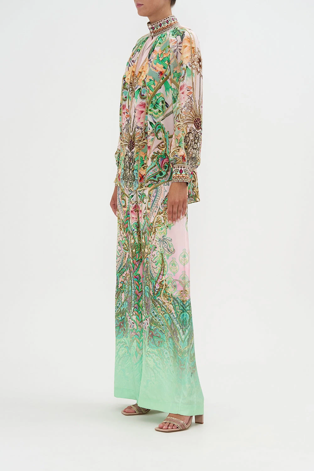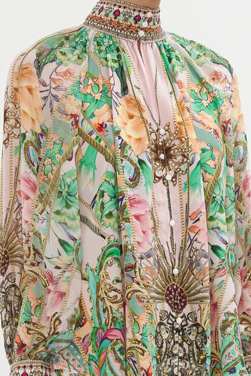 The Lost City Raglan Button Up Shirt enwraps our gaze with a kaleidoscope of minty greens and gentle pinks as baroque details dipped in gold intertwine with paisley patterns. Crafted with crystal adornments, this luxury silk chiffon blouse plays host to a hand-embellished collar that melts into billowy blouson sleeves, tapered cuffs echoing golden hardware and a softly relaxed silhouette that falls into flared hemline.