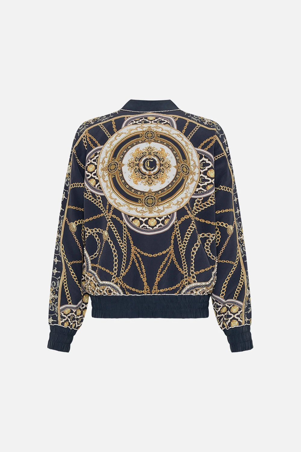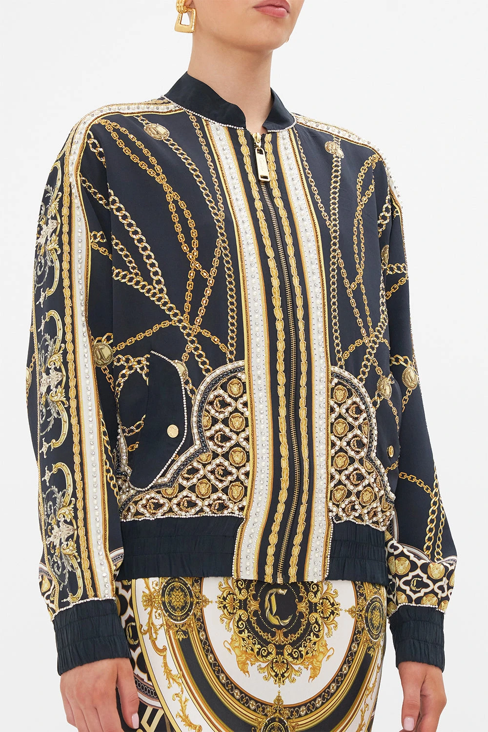 The Tether Me Not Relaxed Bomber Jacket is an immersion into an opulent world of sleek palatial curves, offset with sharp monogram mosaics. Gilded baroque adornments and chains glimmer against graphically bold onyx and ivory contrasts. Boldly detailed with heavy hand-embellishments, this luxury statement silk bomber jacket features a relaxed silhouette that homes pocket functionality with pocket flap detailing, fully lined, zip front enclosure, alongside lush ribbed cuffs and hemline for utter comfort and immaculate fit. Lovingly handcrafted and designed in Australia, explore more from The Moral Of The Story: Act II collection.