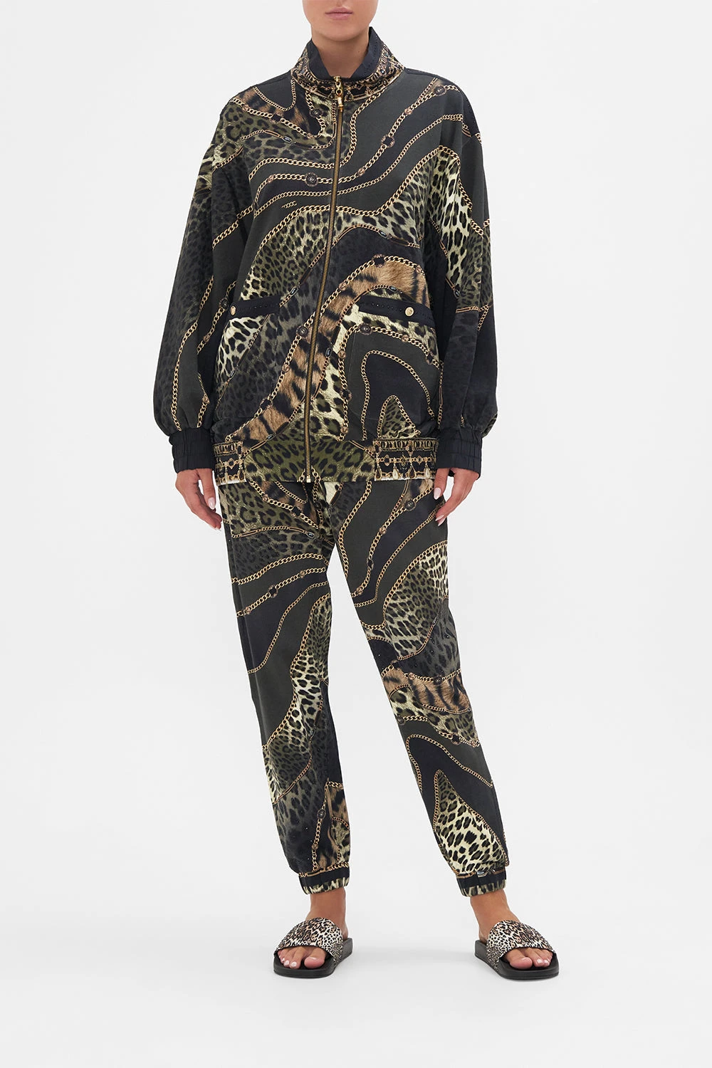 The Lions Mane Retro Lounge Jacket encapsulates a dynamic dance between organic animal print with delicate tribalistic woodcuts enmeshed with delicate chains and sparkling jewels. Featuring silk sleeves and tabs, this luxurious relax fit jacket adorns a front zip enclosure, button details, ribbing on cuffs and a sleek stand collar neckline. Lovingly handcrafted and designed in Australia, explore more from The Moral Of The Story: Act II collection.