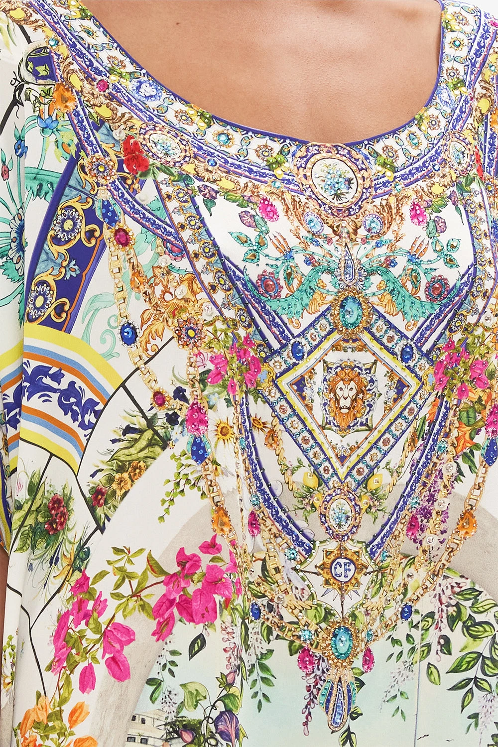 The Amalfi Amore Round Neck Kaftan celebrates the vista views through iconic archways lined with fragrant florals at the Hotel Santa Caterina. Adorned with shimmering crystals, this luxury silk kaftan is home to a generous rounded neckline, cropped sleeves and a relaxed maxi silhouette. Explore our to discover all the ways to wear this perennially perfect CAMILLA wardrobe staple. Wear as luxe resort wear or as a statement party dress. Lovingly handcrafted and designed in Australia, explore more from the Amore Mio collection.