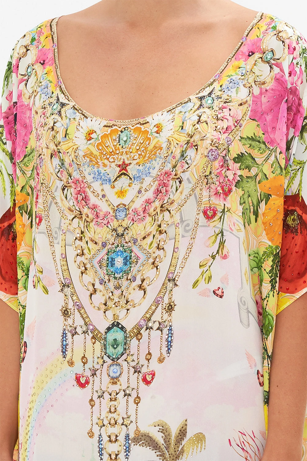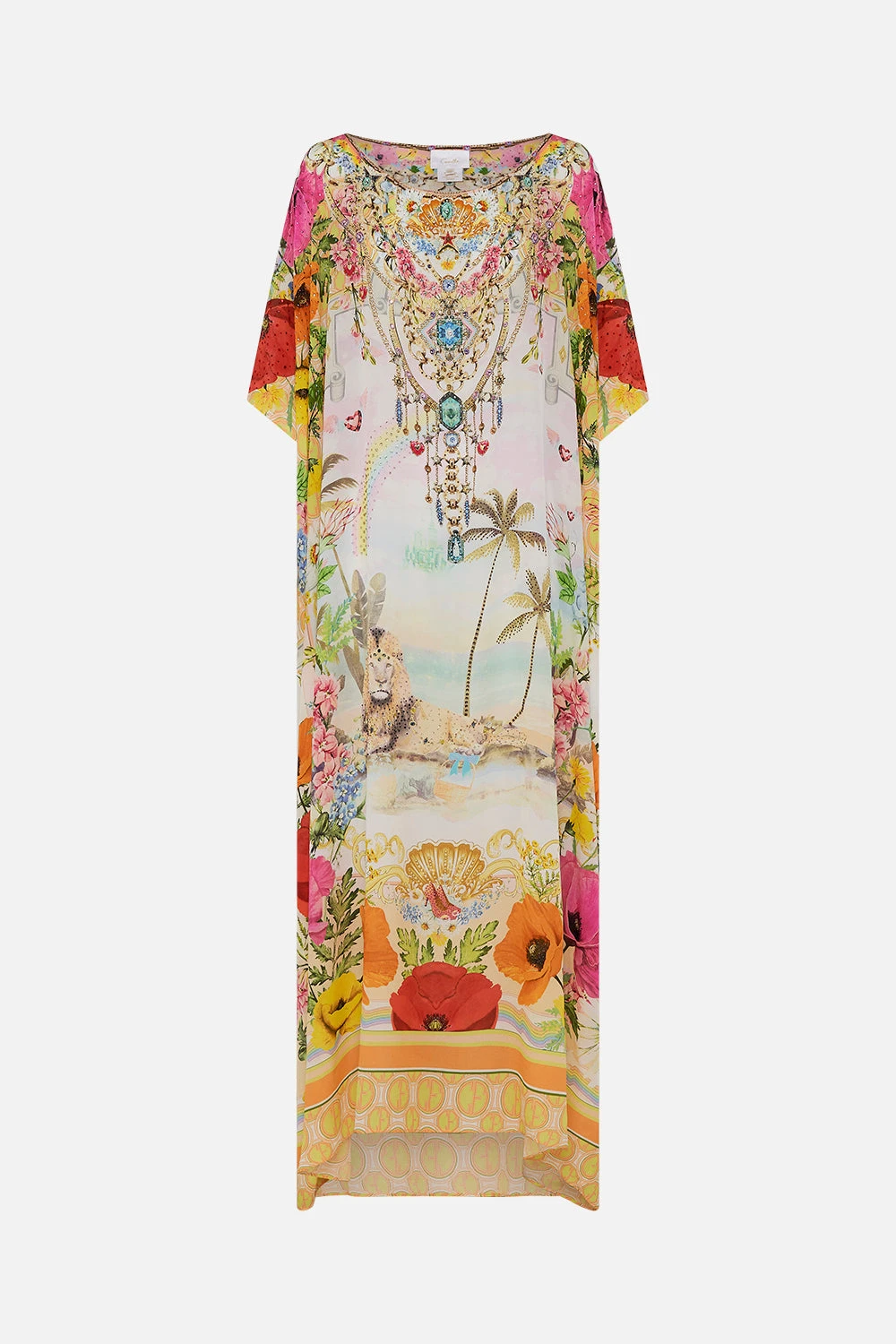 The Sunlight Symphony Round Neck Kaftan captivates the eye with a soft pink hue finished with poppies wrapped in gentle blues, carnations in blushing tones and the delicate cascade of leafy vines. Adorned with hand-embellished crystals, this luxury silk kaftan is home to a generous rounded neckline, cropped sleeves and a relaxed maxi silhouette.
