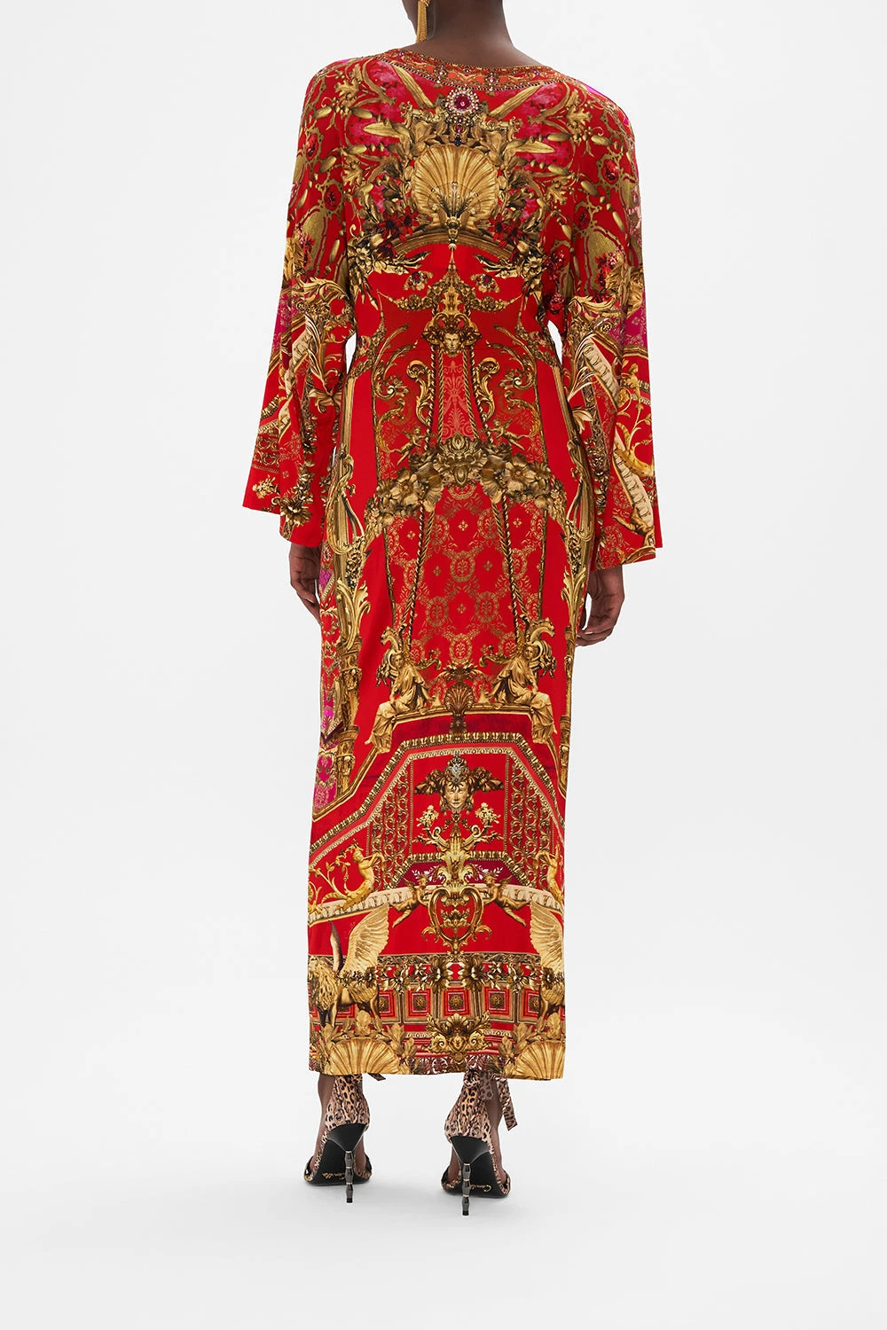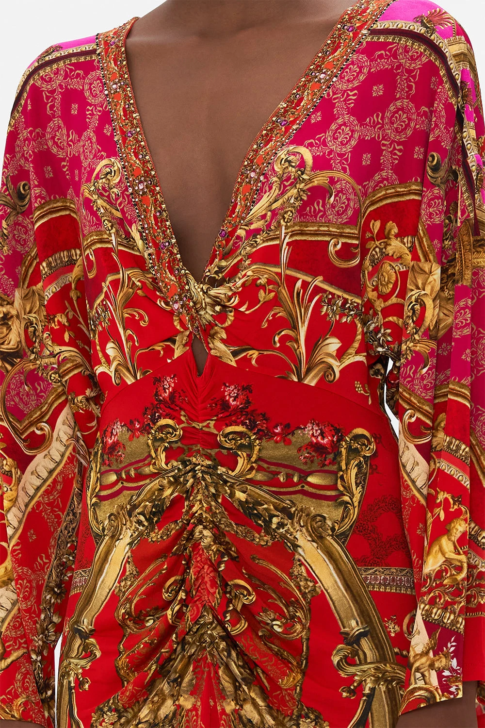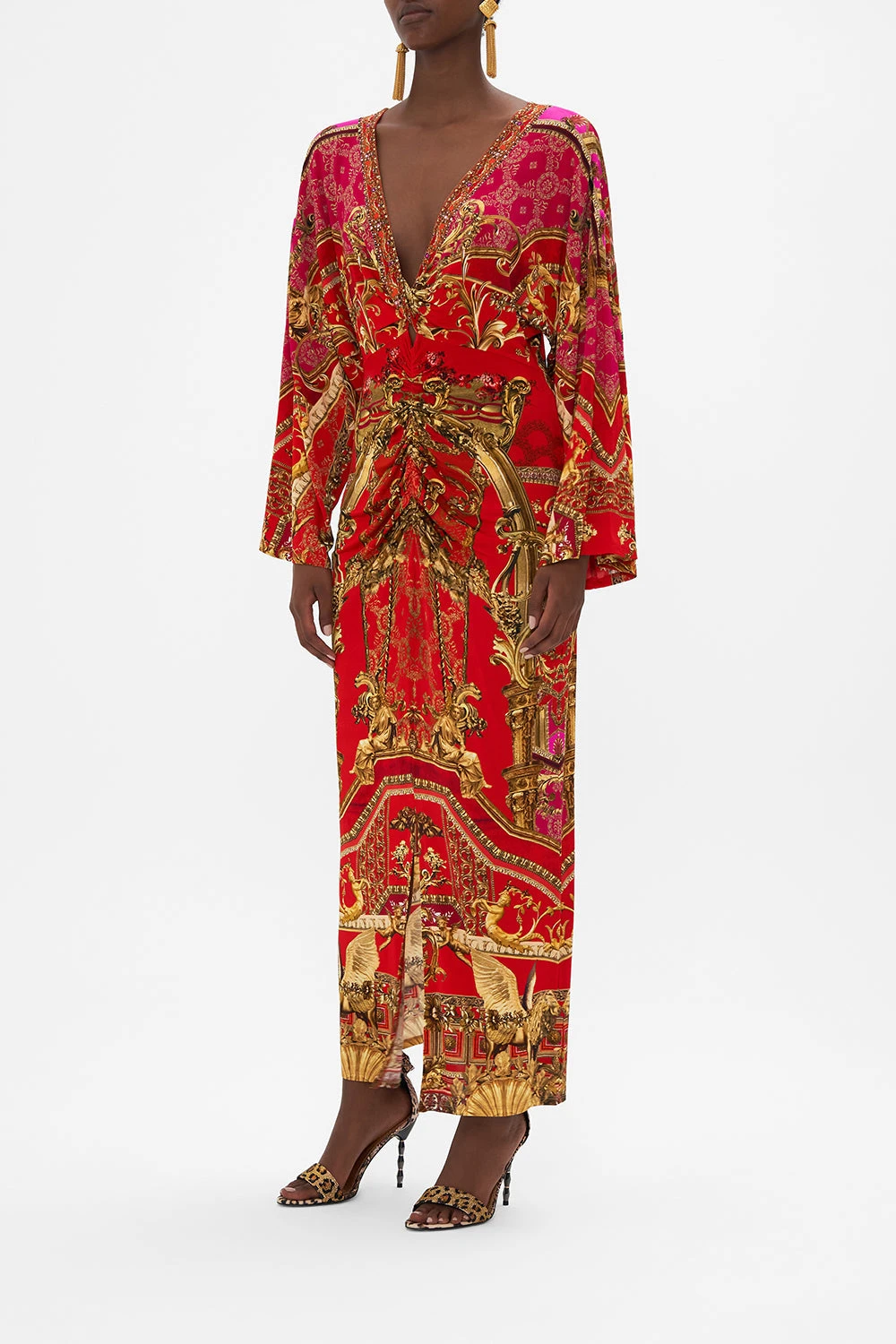 The Sweet Soprano Ruched Front Jersey Dress emulates the vibrant opulence of the infamous Teatro alla Scala with the grandeur of rich ruby reds entwined with gilded accents. Adorning a sleek cut out front detail, this luxury jersey dress features a v neckline, luscious long sleeves, a ruched waist to cinch and shape the midi silhouette. Designed for decadent daywear or exquisite evening styling. Lovingly handcrafted, designed in Australia. Explore more from the Amore Mio collection.