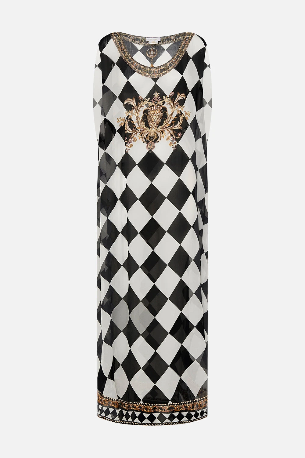 The Duomo Dynasty Sheer Round Neck Kaftan pays homage to the opulent palatial interiors of the past. A striking mosaic of ivory and onyx highlights the glimmering gold charms and royal crests imbued in myth and magic. Adorned with crystal embellishments, this luxury silk kaftan is home to a generous rounded neckline, cropped sleeves and a relaxed maxi silhouette. Explore our style guide to discover all the ways to wear this perennially perfect CAMILLA wardrobe staple. A beautiful resort wear style worn over swimwear or layered over a slip as a sensually sheer flowy dress. Lovingly handcrafted, designed in Australia. Explore more from the Amore Mio collection.