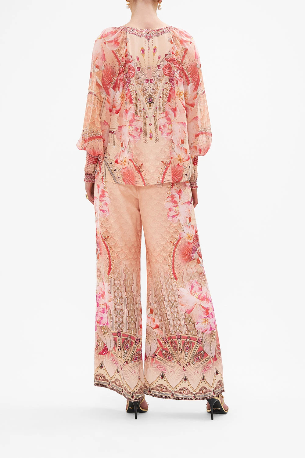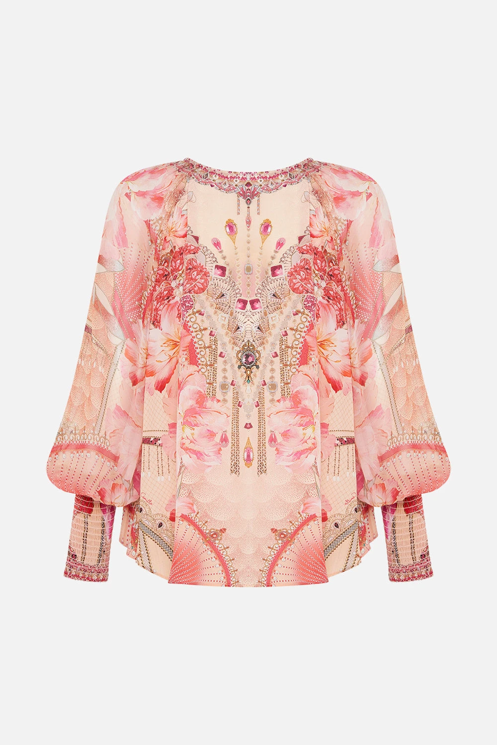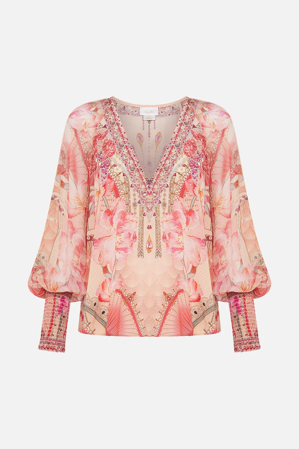 The Adore Me Shirred Cuff Blouse embodies an arrangement of soft pink blooms set against peachy blush tones and delicate unfurling fans of pretty pearls and sparkling jewels. Complete with hand-embellished CAMILLA crystals, this luxury silk crepe blouse is home to billowy blouson sleeves, a deep v neckline that meets an intricate amulet, shirring details at the cuffs and a relaxed silhouette made perfect for French tucks. Lovingly handcrafted and designed in Australia, explore more from The Moral Of The Story: Act II collection.